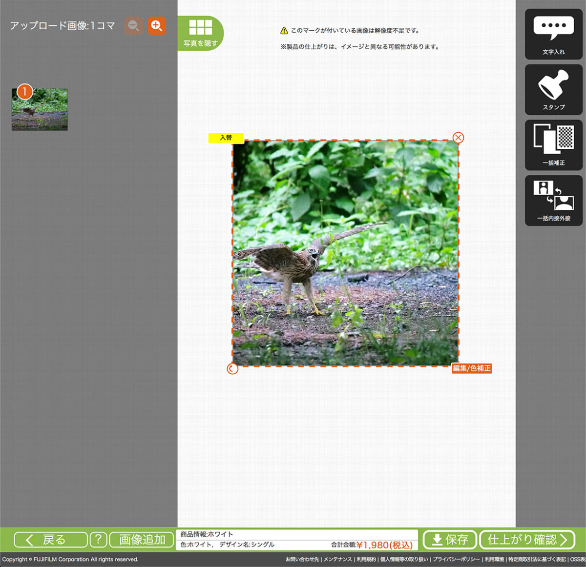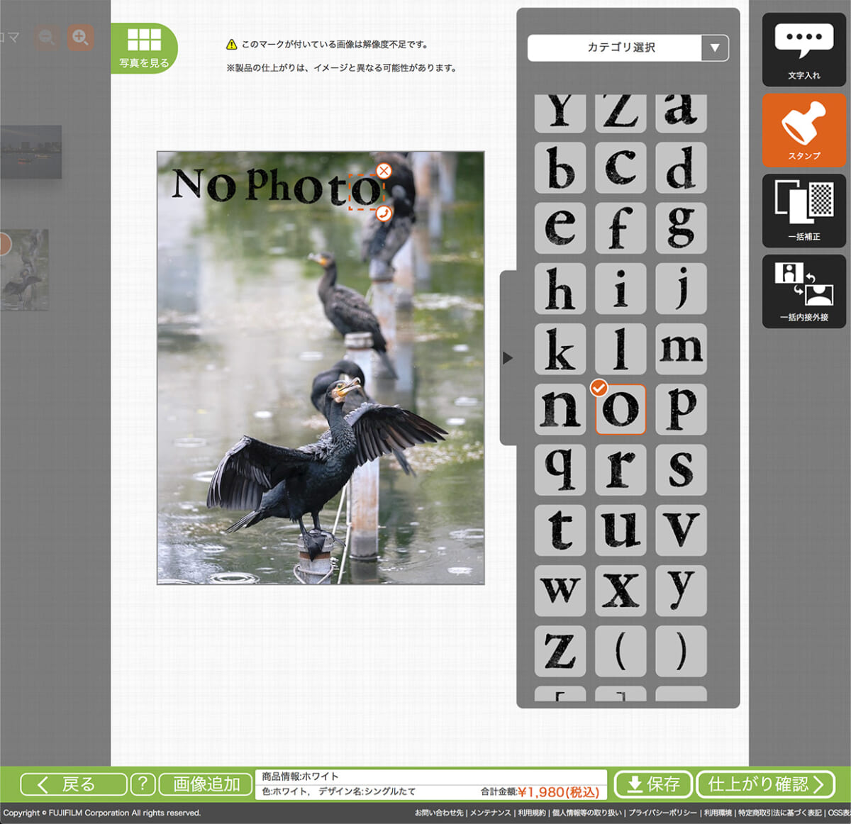 弱点はデザインの自由度で、前面印刷か背面印刷、または両面印刷(1980円)しか選べないこと。またWeb上での確認画面などはなく、メールで送られたデータを確認することしかできません。自前のアプリなどで自由にデザインできる人には問題ありませんが、web上でいろいろデザインをしたい方ならFUJIFILMの方がよいでしょう。ちなみに印刷できる面積は、わずかに格安の方が大きいです。