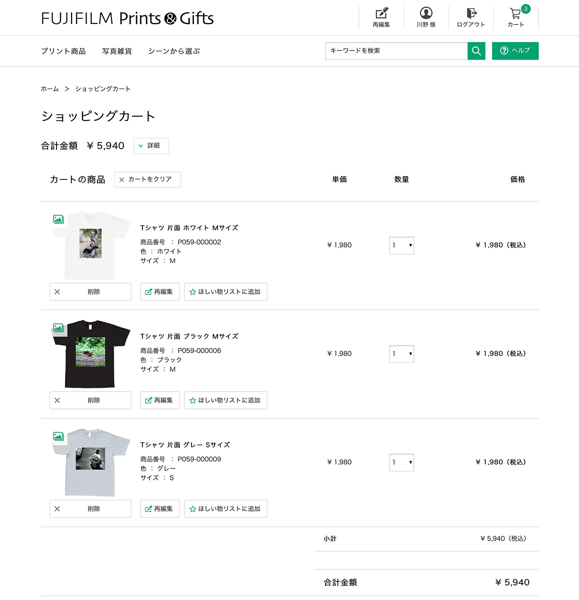 FUJIFILM Prints&Giftsなら、アプリなどを使わずWebサイトにアクセスするだけで、デザイン選択、画像データのアップロード、編集、Tシャツのサイズ選択、注文、決済まで完了します。これならはじめての注文でも迷わず、失敗する心配もありません。価格は1枚1980円で、送料は宅配便なら全国一律610円、写真店かセブンイレブン受け取りなら送料は不要、納期は約2週間です。