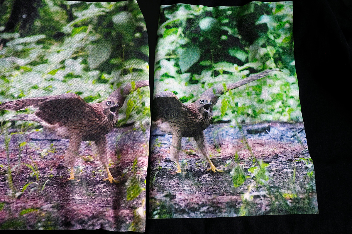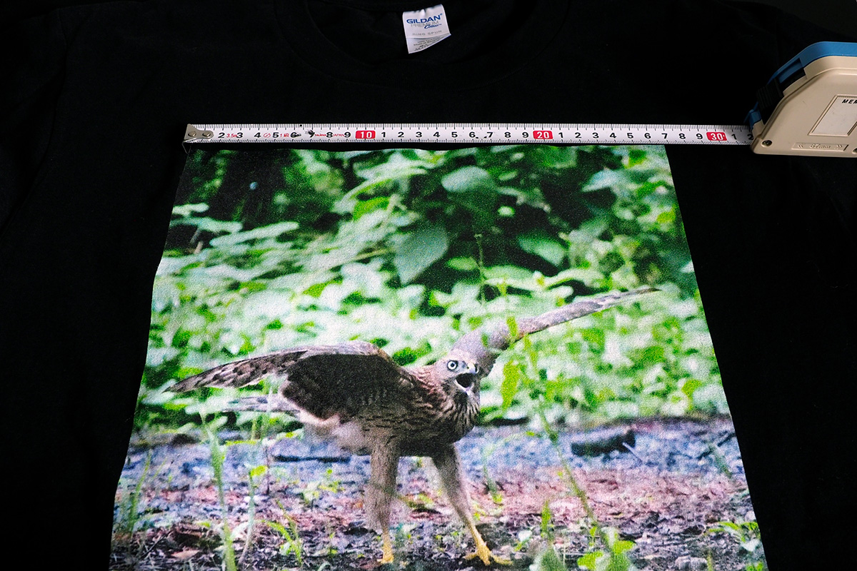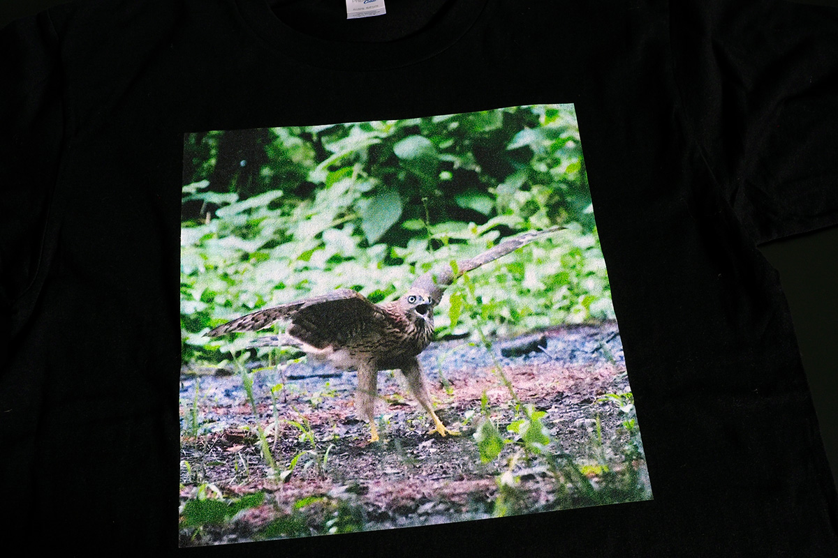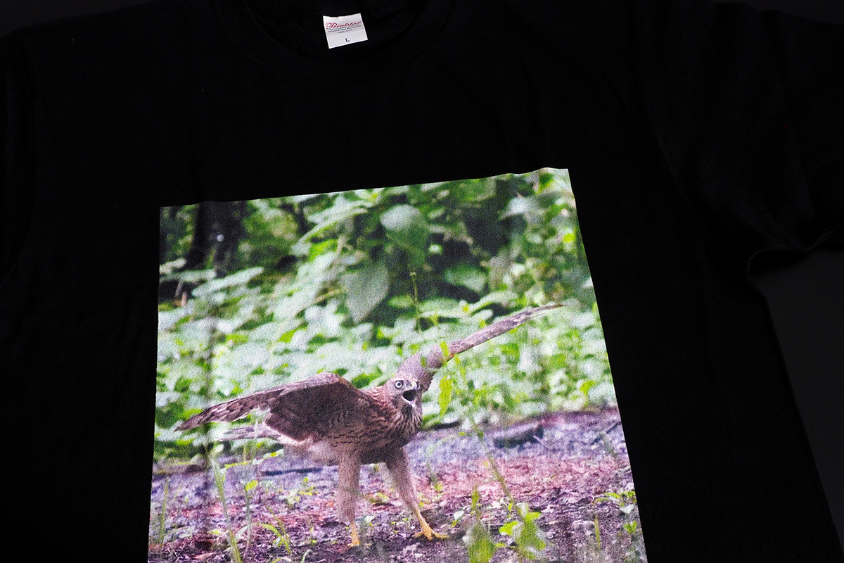 それでは肝心な印刷の質はどうちがうのか。最初に届いたTシャツを見た感想としては、“そんなに悪くない”という印象でした。オリジナルデータより、色合いがやや赤っぽく、FUJIFILMのものと比較すると色がやや薄いことを除けば、それほど遜色はありません。よくよく見るとインクがヌケている部分がありますが、これは白いTシャツを選べばもっと目立たなくなると思います。Tシャツ自体の質は生地に厚みがあり、テカテカしない黒の質感も良く、価格の割には健闘しているといえるでしょう。