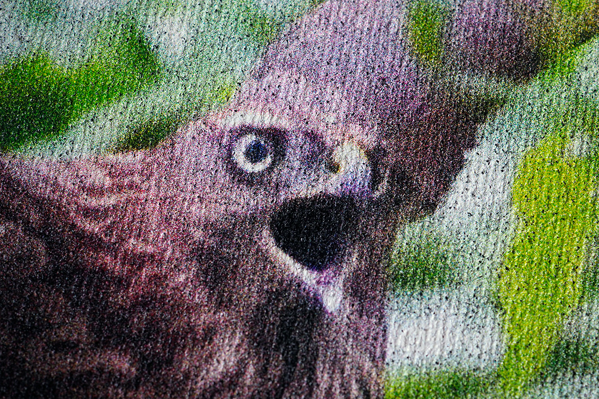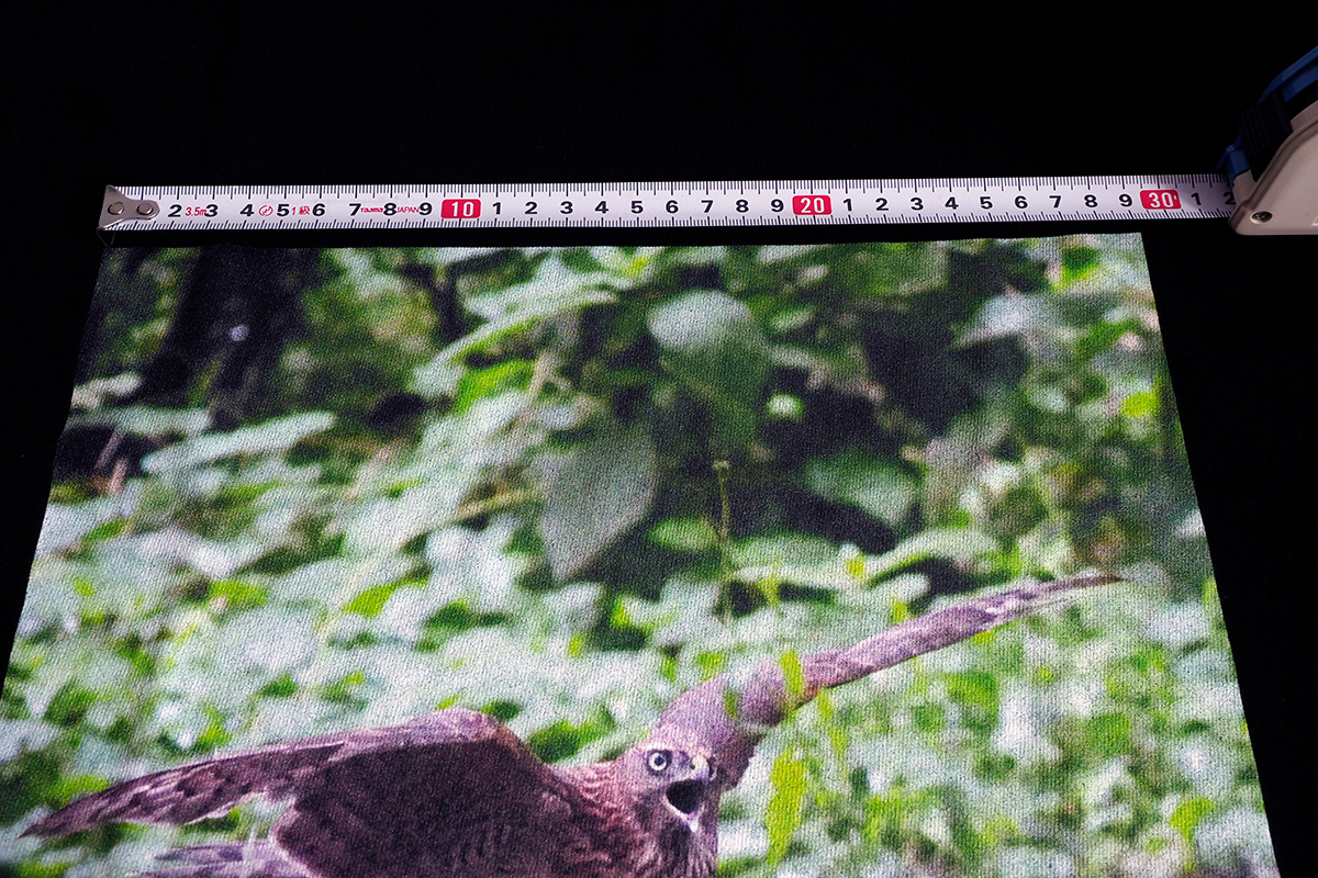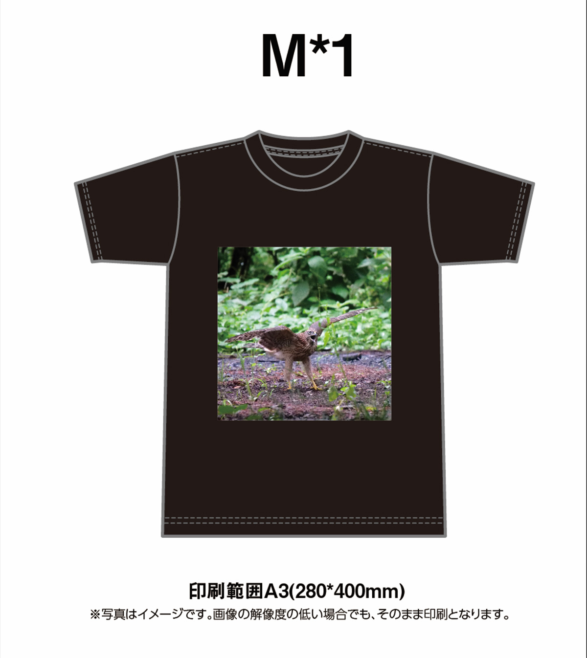それでは肝心な印刷の質はどうちがうのか。最初に届いたTシャツを見た感想としては、“そんなに悪くない”という印象でした。オリジナルデータより、色合いがやや赤っぽく、FUJIFILMのものと比較すると色がやや薄いことを除けば、それほど遜色はありません。よくよく見るとインクがヌケている部分がありますが、これは白いTシャツを選べばもっと目立たなくなると思います。Tシャツ自体の質は生地に厚みがあり、テカテカしない黒の質感も良く、価格の割には健闘しているといえるでしょう。