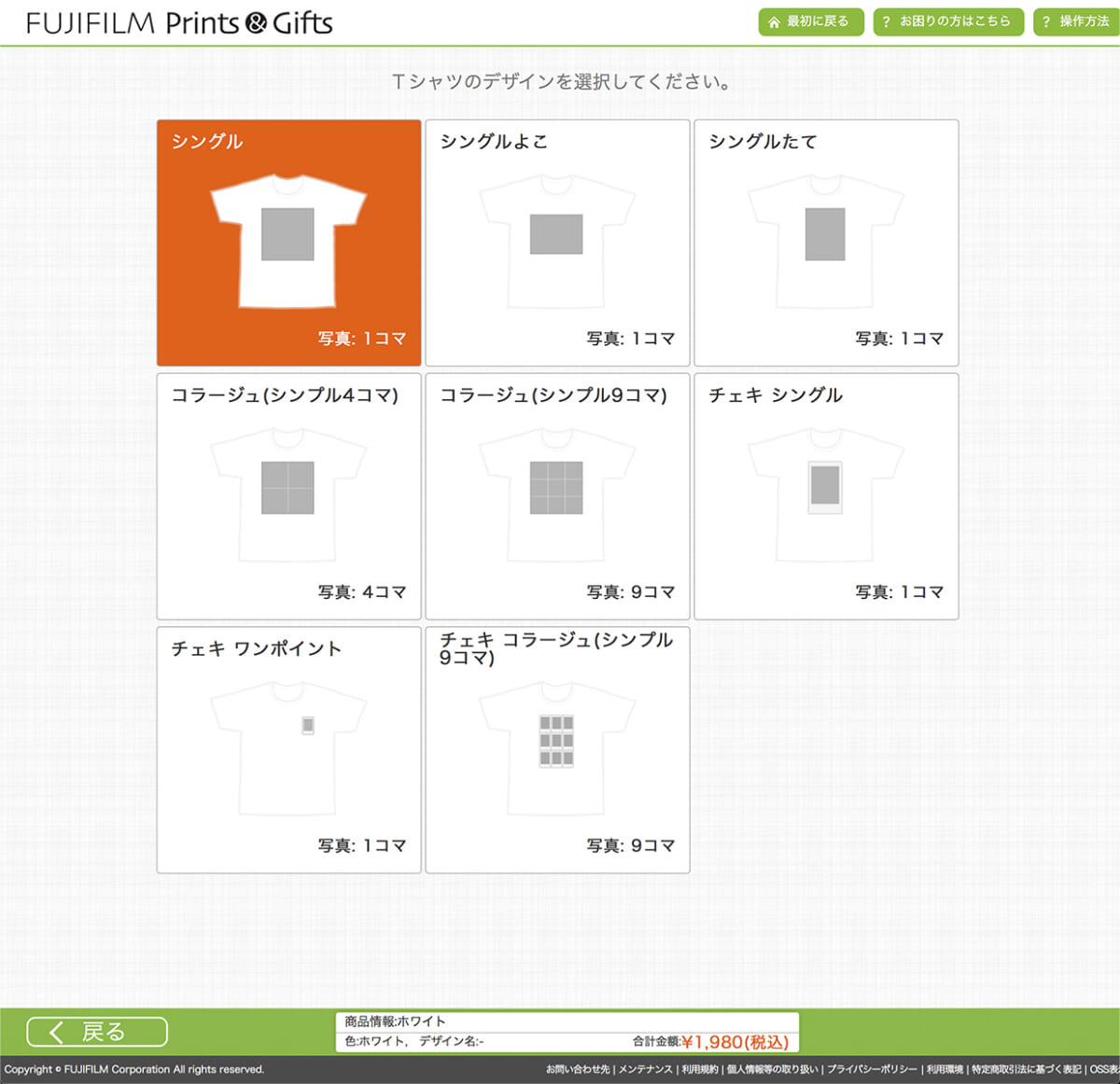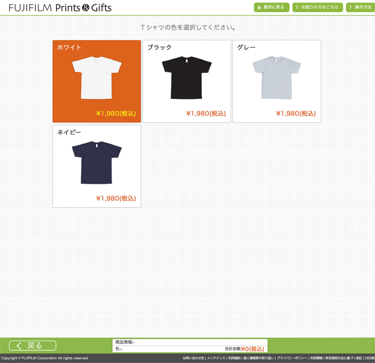 FUJIFILM Prints&Giftsで会員登録してTシャツの注文画面へ。まずTシャツのカラーを選択します。どのカラーも価格は一緒です。