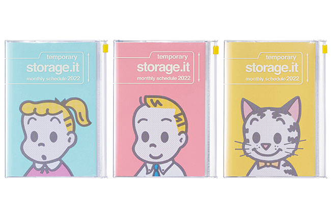 スライドジッパー付きのポケットをカバーにしたシリーズにも、オサムグッズバージョンが。ポケットには、ペンや付箋など、手帳の書き込みに必要なグッズなどを収納して身軽に持ち運べます。中ページは、ブロックタイプのマンスリー。1か月の予定を俯瞰して確認することができます。