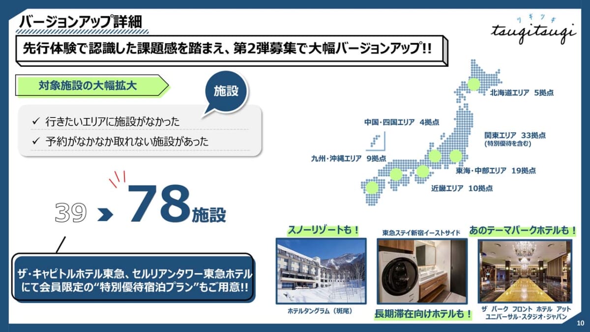 また、対象ホテルを従来の39拠点から78拠点へと倍増して利用チャンスを拡大したことも見逃せません。その中には都市型ホテルであるエクセルホテル東急や東急REIホテルに加え、スノーリゾート地にある「ホテルタングラム」や長期滞在向けホテル「東急ステイ新宿イーストサイド」を用意したほか、今回はテーマパークホテルの「ザ パーク フロント ホテル アット ユニバーサル・スタジオ・ジャパン」まで加えているのです。