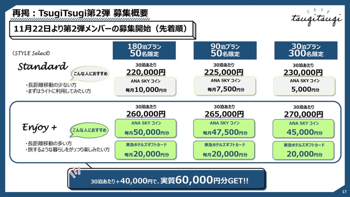 第2弾の募集は400名限定で、専用ウェブサイトから11月22日の12時より開始します。気になる料金は、180泊プランが「スタンダード」で30泊あたり22万円(特典:1万コイン)、「Enjoy+」が26万円(同:5万コイン)。90泊プランは30泊あたり「スタンダード」が22万5000円(同:7500コイン」、「Enjoy+」が26万5000円(同:4万7500コイン)、30泊プランは「スタンダード」が23万円(同:5000コイン)、「Enjoy+」が27万円(同:4万5000コイン)。なお、「Enjoy+」を選ぶとすべてのプランに東急ホテルズギフトカード2万円分が追加される予定です。