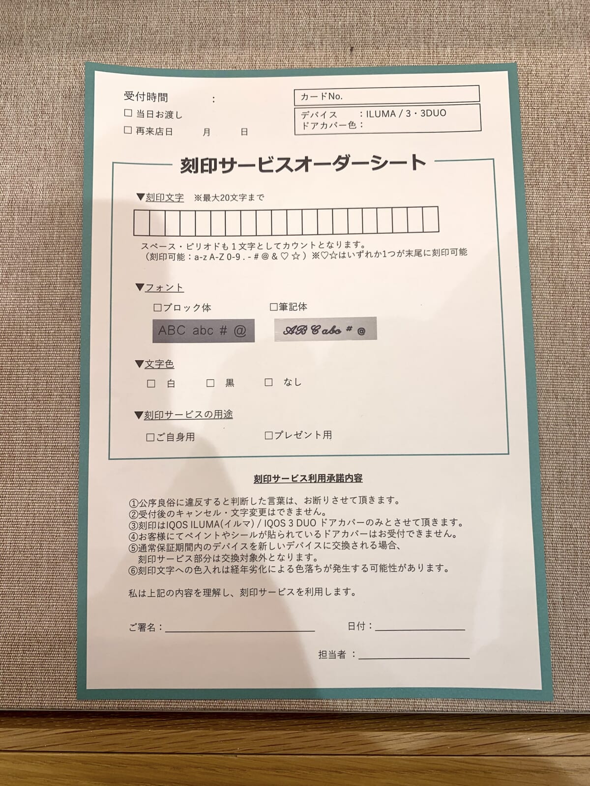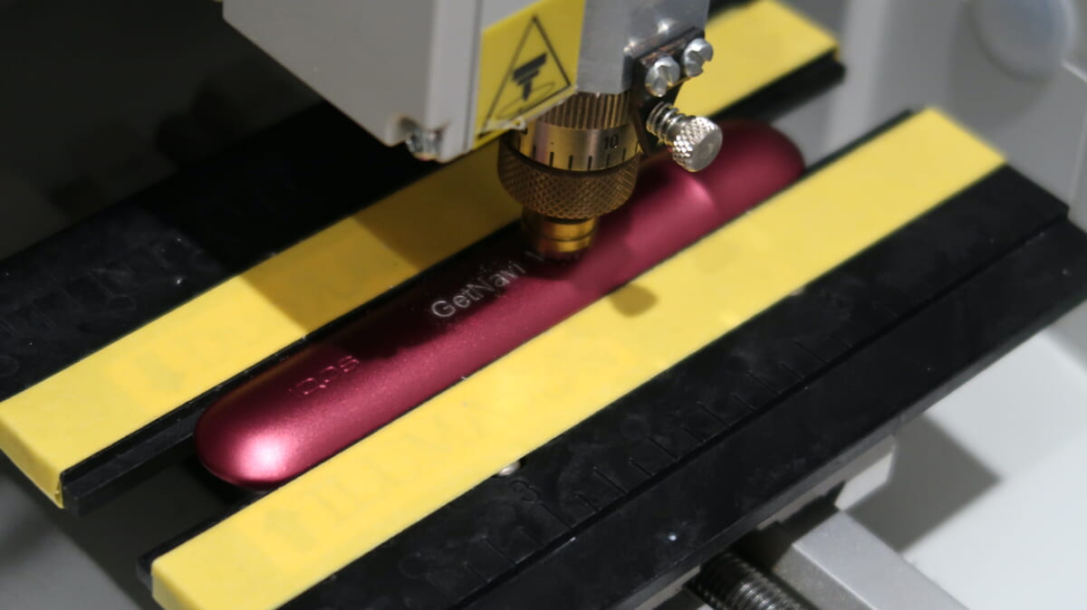 早速、筆者が挑戦してみました。まずは刻印サービスオーダーシートに刻印したい文字を書き込みます。刻印文字は英数字20文字以内、ハートや星などの記号も選択可能。フォントはブロック体か筆記体、そして文字色も選べます。筆者は「GetNavi web」ブロック体、黒文字でオーダーしてみました!
