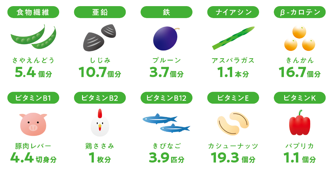 また、それらの栄養素は少量ずつ含まれているわけではありません。ユーグレナ約10億個あたりで、さやえんどう5.4個分、豚肉レバー4.4切身分、きびなご3.9匹分などと、豊富に含まれているのもポイント。
