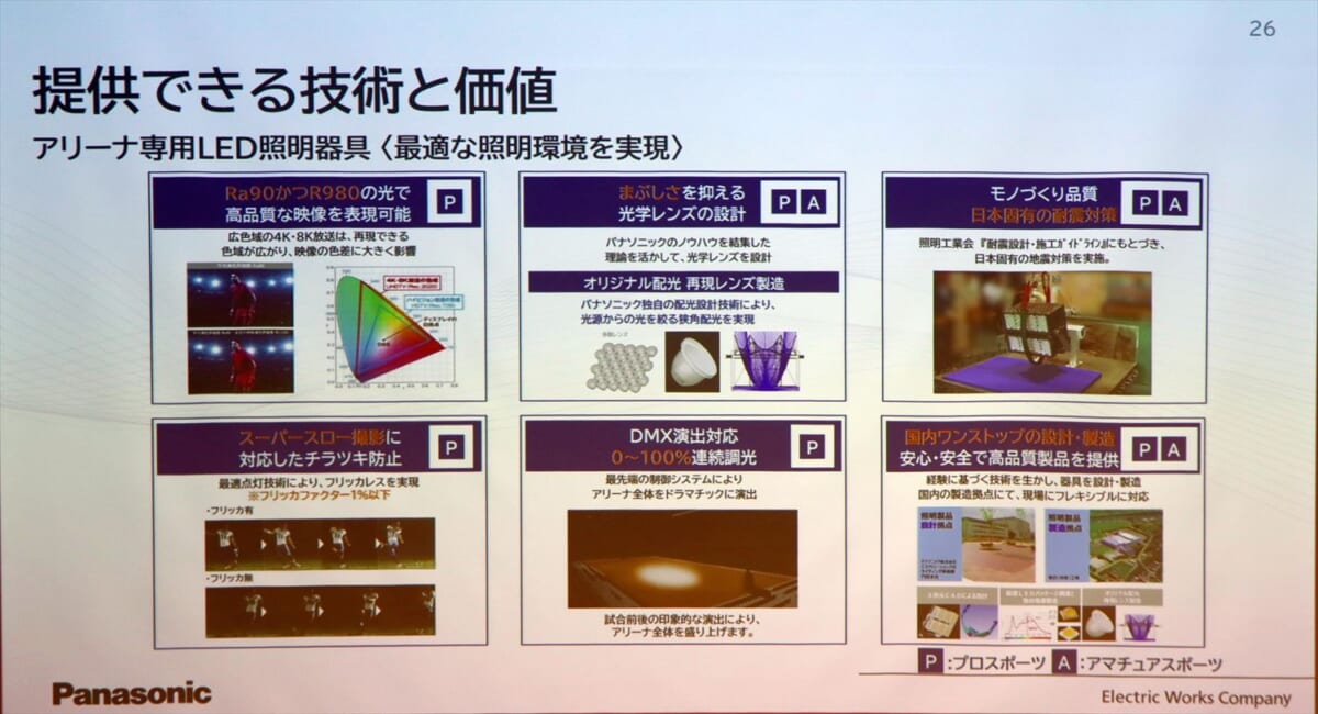 パナソニック・エレクトリックワークス社はこのほど、施設照明を中心にスポーツ事業に本格参入することを表明しました。過去に大井競馬場のナイター照明、最近では青森のスケートリンク「フラット八戸」のアリーナ照明と、GetNavi webでも同社のスポーツ施設関連事業を取り上げてきましたが、これまでは照明事業の一環で取り組んできたものを今後は目標を定めて積極的に営業し、中核事業として大きく育てていく考えです。