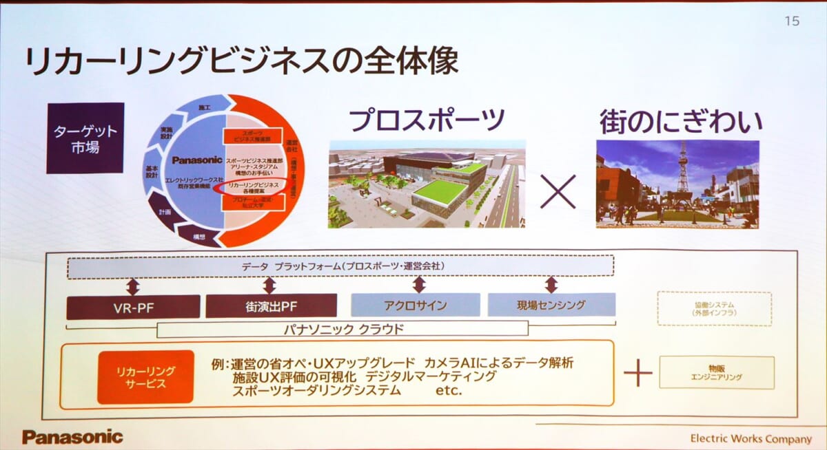 ①のリカーリング(収益継続型)ビジネスは、プロスポーツ拠点のアリーナ・スタジアム内および周辺における照明演出・映像演出を展開。さらに、アリーナ・スタジアムと連動する形での街中照明演出などをパナソニッククラウドで管理、その効果を現場センシングやカメラAIを使用してデータ解析・可視化して運営の省エネ・省オペ化、ユーザーエクスペリエンスを継続的にアップグレードしていくものです。