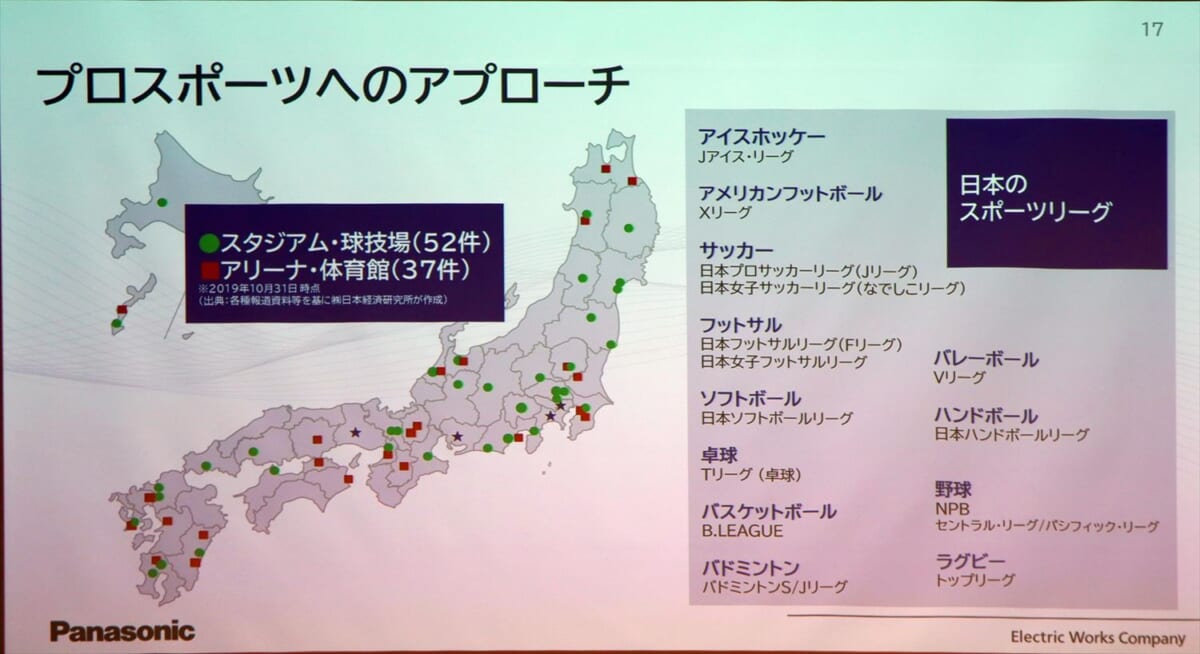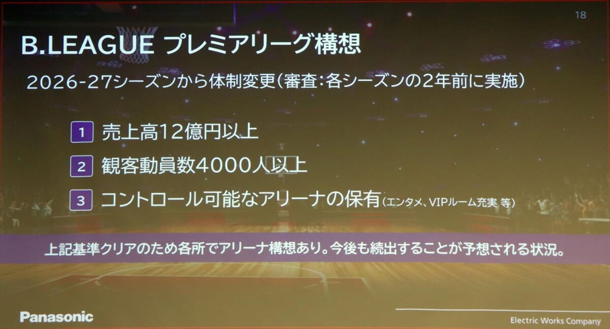 ②のプロスポーツのアリーナ・スタジアムへのアプローチは、全国のアリーナ・スタジアムが対象。2019年のスポーツ庁発表時には、全国には52のスタジアム・球技場、37のアリーナ・体育館がありましたが、現在はさらに増えているとのこと。その中でも、パナソニックは2026-27シーズンに体制変更するプロバスケット「B.LEAGUEプレミアムリーグ構想」に注目しています。各チームに年間売上高12億円以上/観客動員数4000人以上/コントロール可能なアリーナの保有が求められるため、これに対応するため各地でアリーナの改修・新設が始まると見ています。