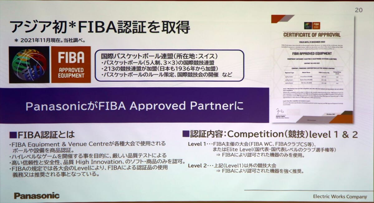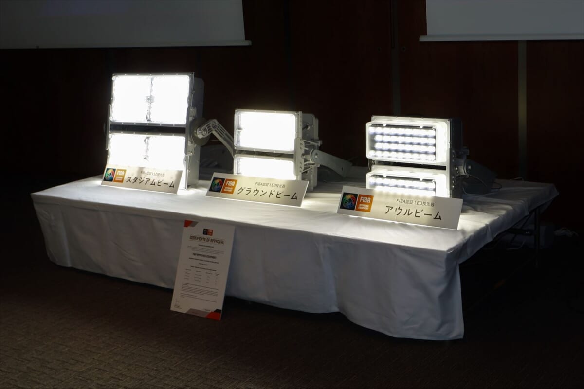 そこでパナソニックでは、自社の既存のアリーナ・スタジアム照明器具3製品について、アジア地域で初めてFIBA(国際バスケットボール連盟)認証を取得しました。FIBA主催の国際大会も開催できるレベルの認証を取得しており、これをもって各プロチームに積極的に営業を仕掛けていく方針。