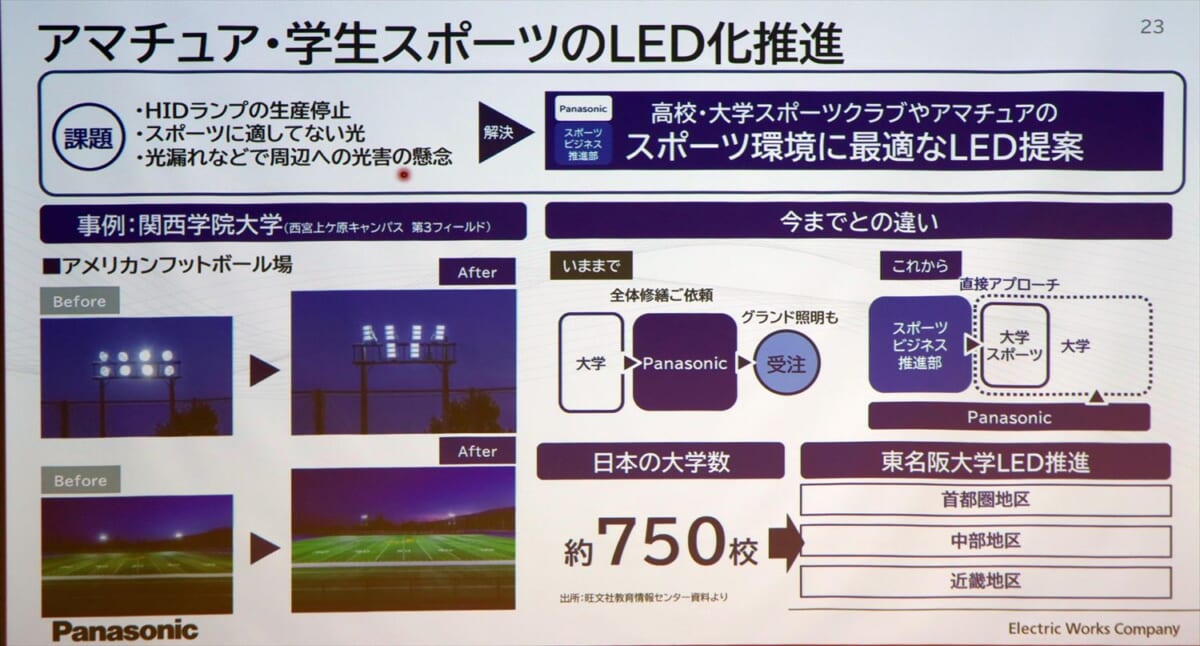 同社はこれまでもプロおよびアマチュア両面で多くのスポーツ施設の照明器具を設置してきました。これまでは大学などの施設運営者や他のSIerからの依頼から始まる、いわゆる受け身の営業でしたが、今後は自社で積極的に提案・コンサルティング営業を仕掛けていきます。また、自社で生産する照明器具だけでなく、パナソニックグループが持つ大型ビジョンやスピーカー、高性能カメラといった映像・音響機器ほか、他社の製品も合わせ、スポーツ施設を中心とした町づくりを総合的に提案できるSIerとして活動していく方針です。