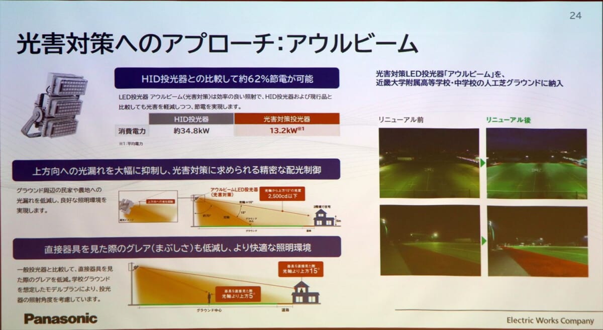 こうした問題を解消すべくパナソニックでは、VR技術を利用した事前シミュレーションと現地調査、プレーヤーへの聞き取り調査などにより、プレイおよび周辺環境に配慮した照明設計を提供していくとしています。