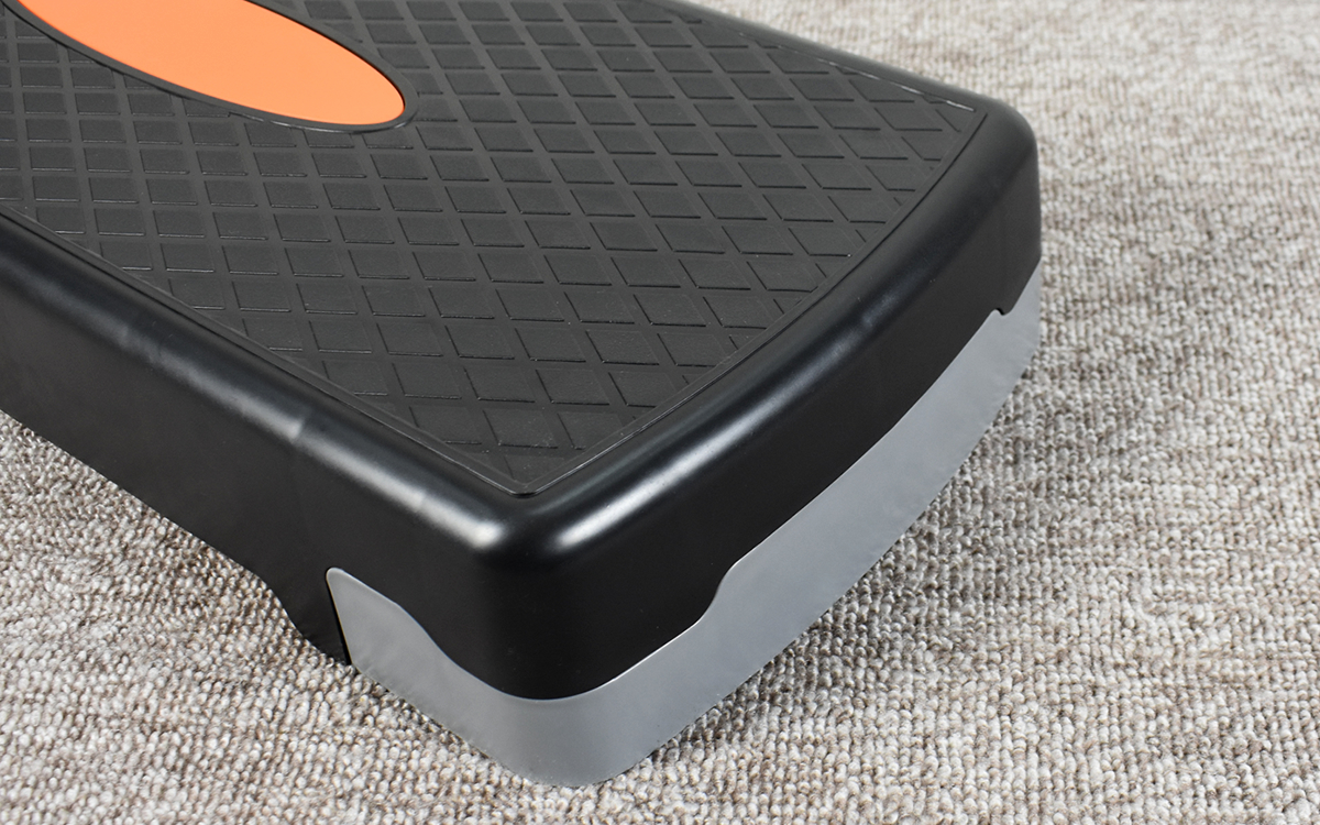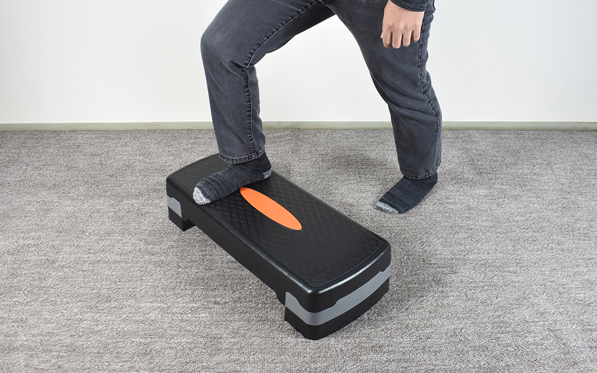 それでは、商品を使って踏み台昇降運動にチャレンジ。画像をご覧のとおり、左右に脚をつけ足して15cmの高さでおこなってみました。見た目はそれほど高く感じなくても、実際に昇降運動を繰り返していると徐々に体力を消耗していく感覚が。説明書に記されたステップ方法や運動ガイドラインに従いつつ、たとえば音楽のリズムに合わせて運動すれば楽しくシェイプアップできるのではないでしょうか。