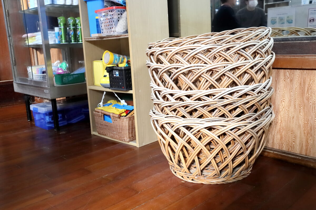 玉袋 ここに来て、まず懐かしかったのが脱衣所の籠。昔はロッカーなんてなくて、お風呂屋さんは全部これだったからね。今日、久しぶりに見てうれしくなっちゃった。
