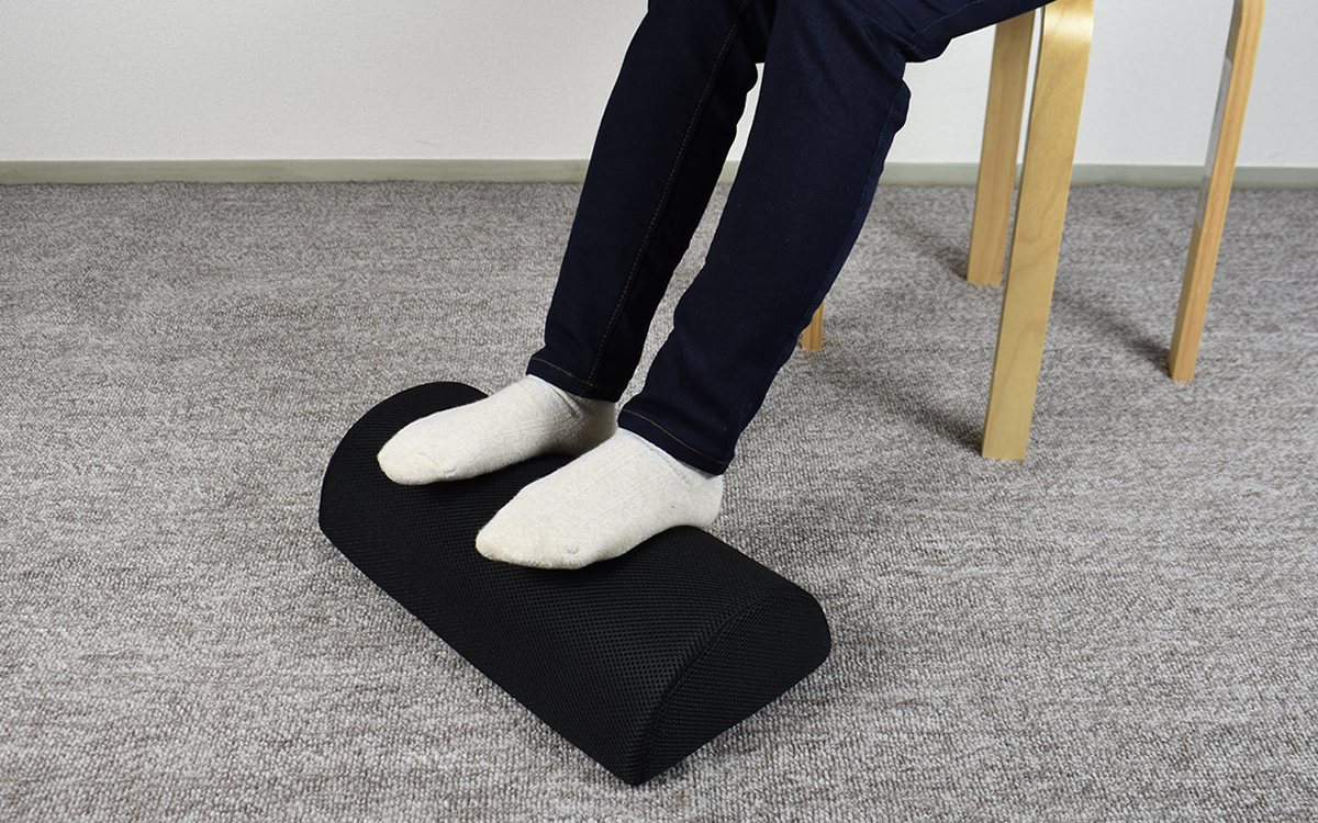 それでは実際に、椅子に座った状態で足の下に同商品を置いてみましょう。ほどよい反発性により、体重をかけても安定感はバツグン。半円型にカーブした形状も足の裏にフィットして、自然な姿勢で足を置くことができました。