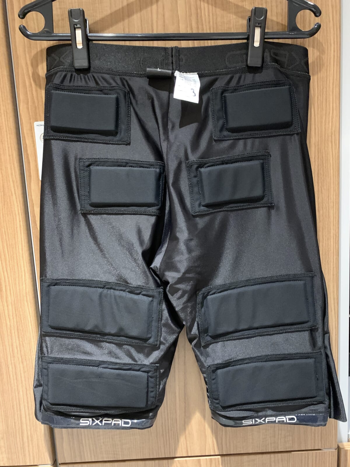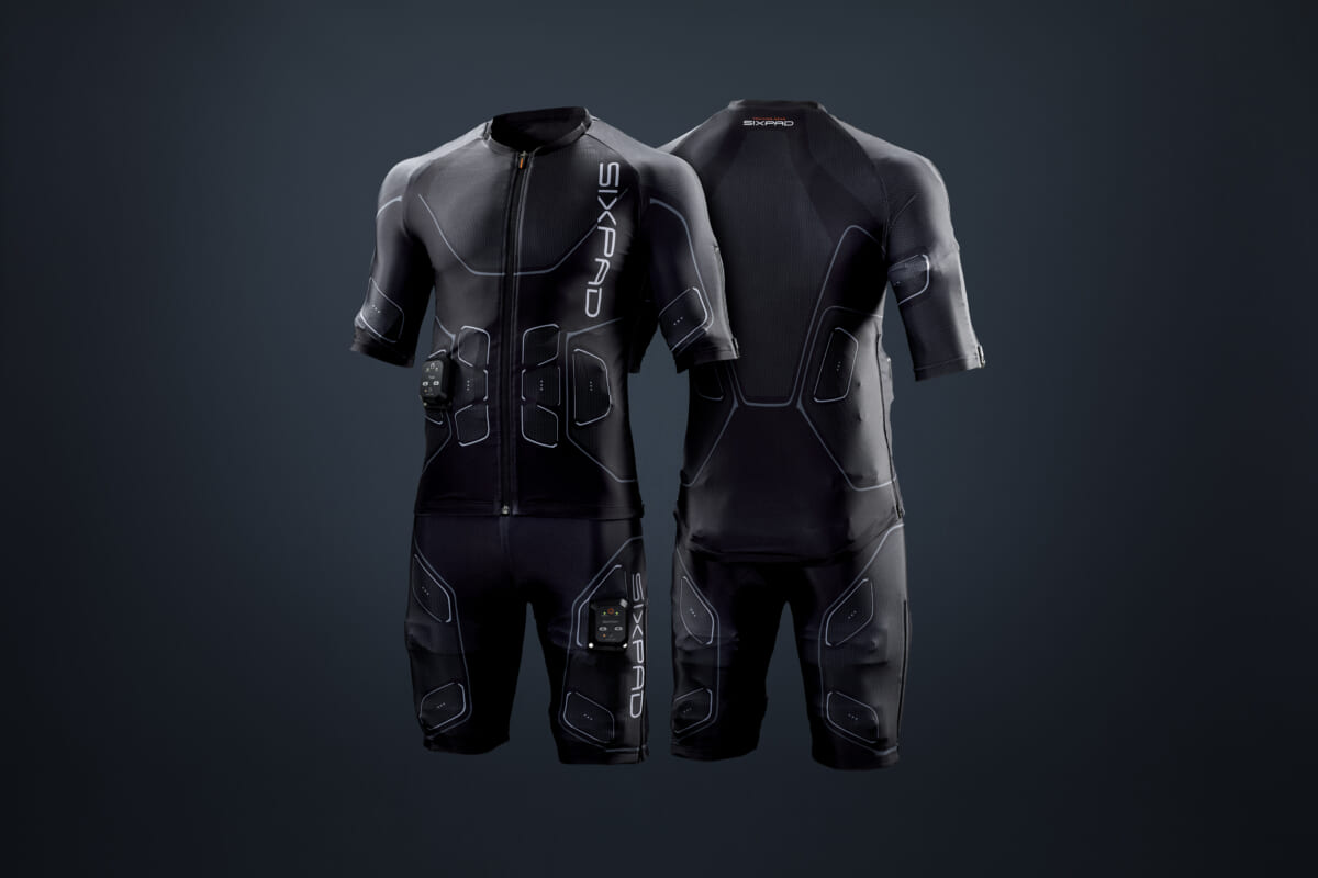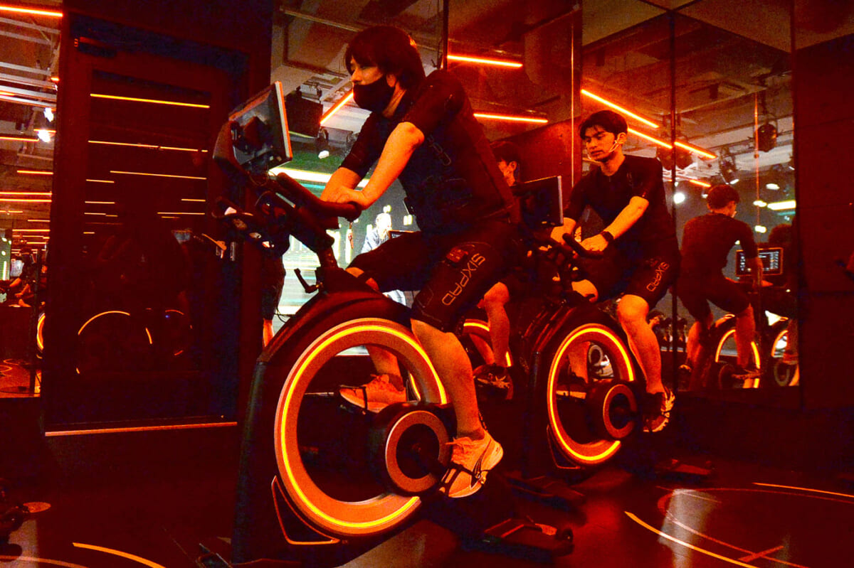まずロッカールームで、EMSトレーニングスーツ「シックスパッド パワースーツ(SIXPAD Powersuit)」に着替えます。シックスパッド パワースーツは、シックスパッド独自のコアテクノロジー「 シーエムエムパルス(CMM Pulse)」を応用し開発した、全身7部位14か所の筋肉を同時に、効率的に鍛えられるスーツです。バイクトレーニングなどの有酸素運動時にEMSを併用することで、EMSによる筋トレに類似した効果が同時に得られるとともに、より多くのカロリー消費が期待でき、最短10分の短時間・高効率の「ハイブリッドトレーニング」が可能になるとのこと。