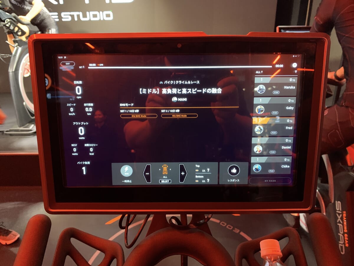 一旦休憩してから、続いてはシックスパッドホームジム専用バイクのThe Bike EXに跨ります。今度はバイクトレーニングとなり、ヘトヘトのなか再びトレーニング開始です。座りこぎ、立ちこぎを繰り返すEMS+有酸素運動はかなりキツい! しかしここでも、運動不足の筆者の気持ちを救ったのはステージ上のインストラクター・MAMIさんのエールでした。女性からのエールなので、尚更もう少し頑張ろうという気持ちになり体を追い込みます。……バイクトレーニング終了、バイクから降りると足はもうフラフラでした。