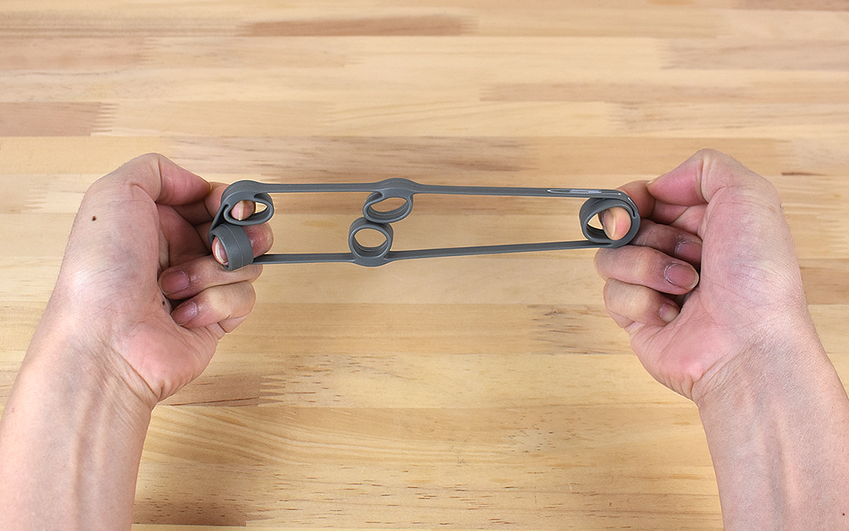 3つとも大きさは同じで、手のひらにおさまるコンパクトなサイズ感。ふにゃっとやわらかいラバー製でできており、伸縮性バツグンです。それぞれのカラーによって強度が違い、オレンジは初心者向けで比較的伸びやすい素材。グレーは日常的なエクササイズにオススメな中程度の負荷、ブラックはハードなトレーニング用に使えます。