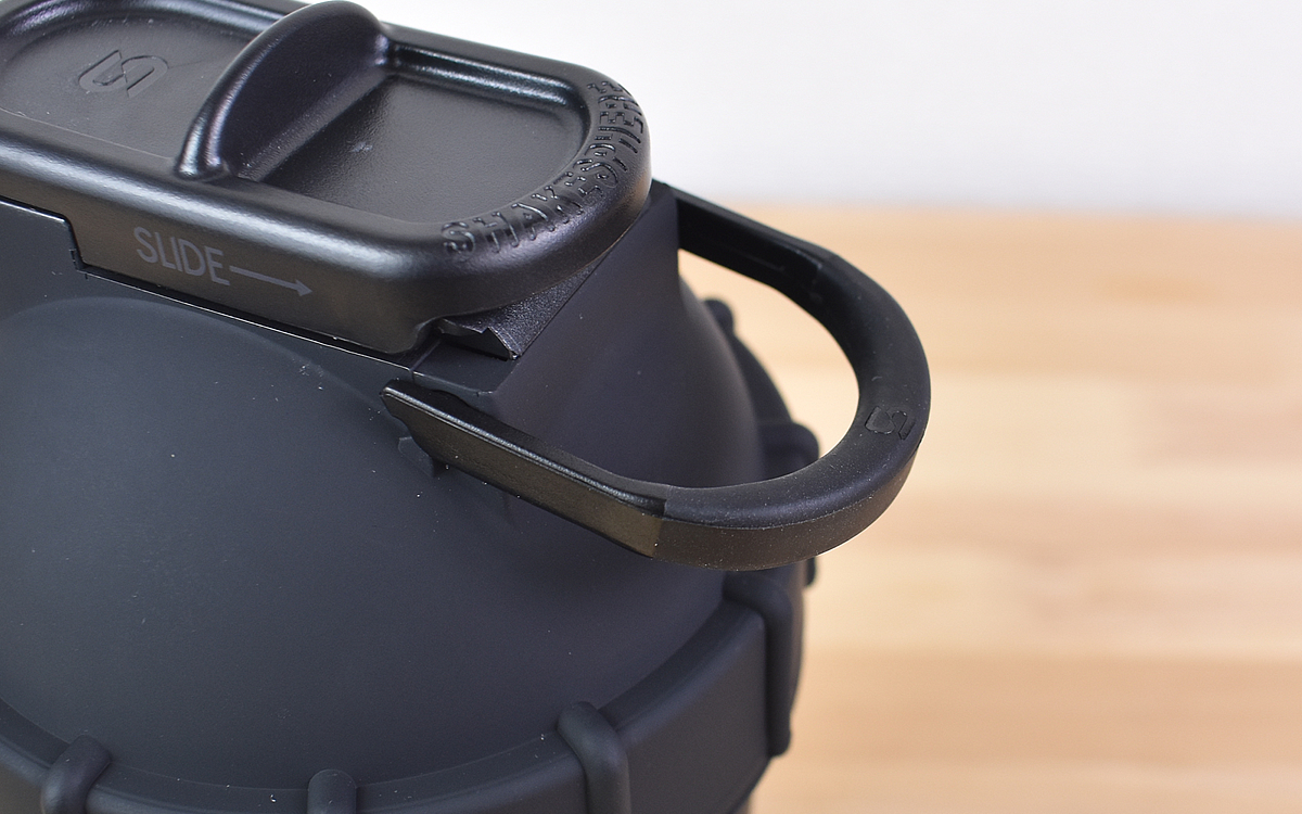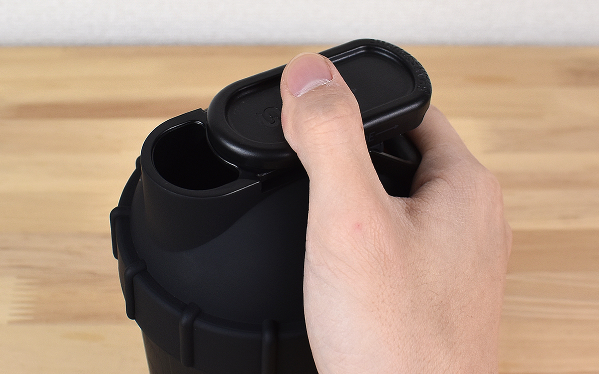 飲み口にはシリコーンがついたスライド式キャップを採用。ピタっと口が閉じるため、ドリンクが漏れてしまう心配はありません。またキャップのすぐ後ろにフックがついているので、持ち運びにも便利です。