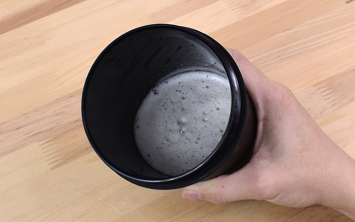 それでは実際にバナナスムージーを作ってみましょう。まずはバナナだけ入れて30秒ほどシェイクすると、原型をとどめていないほど粗くなっていてびっくり! 続けて水を入れて上下にしばらく振ったところ、ご覧のとおり見事なスムージーが完成しました。