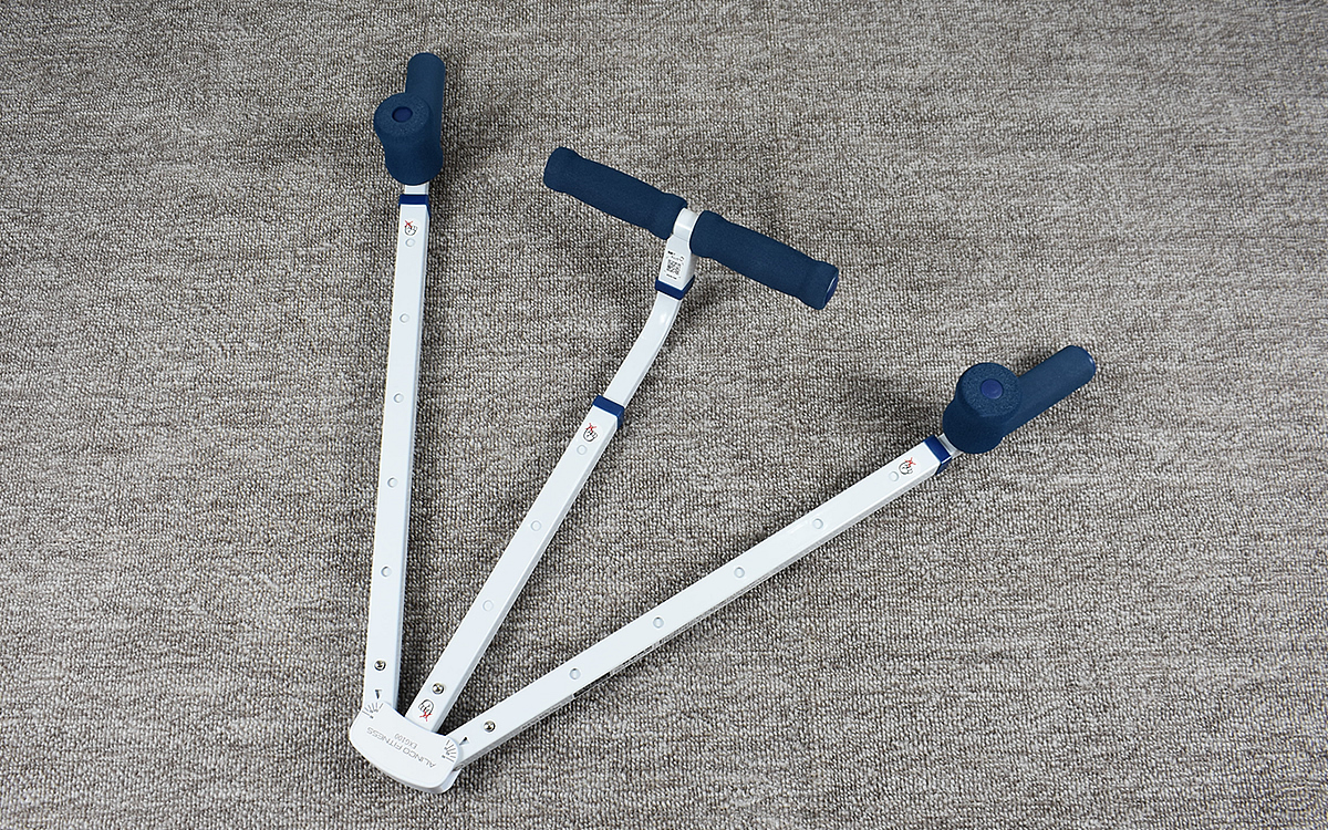 まずは、パッケージから取り出した商品の組み立てからスタート。といっても左右の“開脚バー”にフットパッドを取りつけ、中央の“ハンドルバー”にハンドルを差しこむだけで準備完了です。
