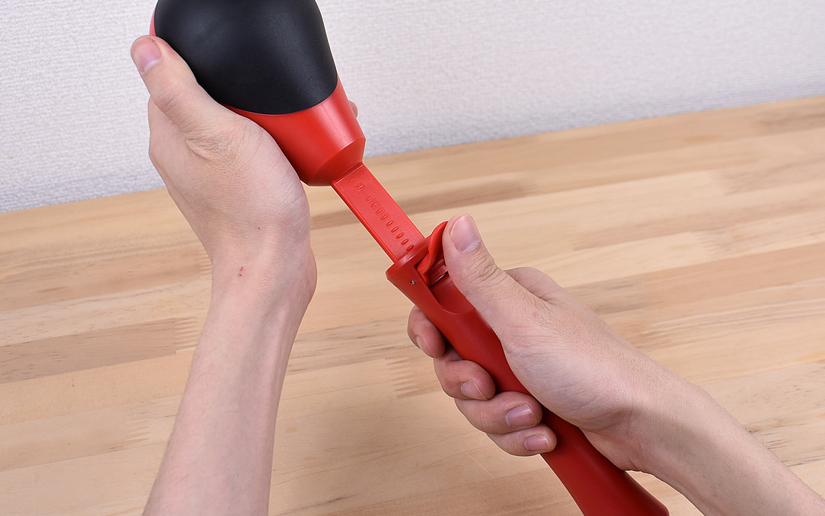 重量は170gと軽く、長さが27~40cmまで伸縮できるのも同商品の特徴。グリップ部分にあるストッパーを解除することで、35段階にわたって長さを調整することができます。短くしておけば持ち運びやすく、長く伸ばせば握りこぶしでは届かない背中もたたきやすくなるのではないでしょうか。