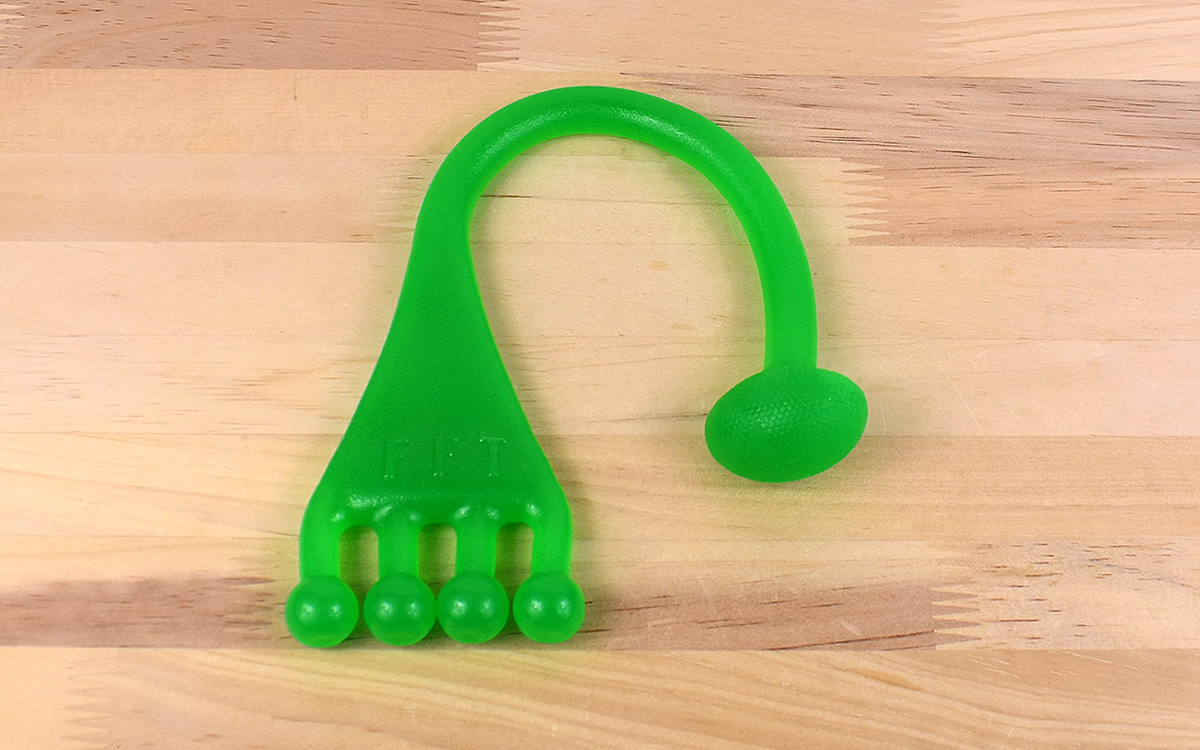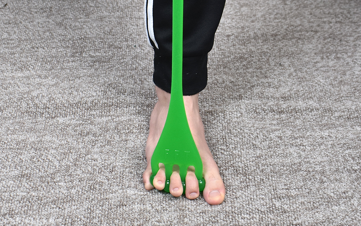 商品公式ページによると、強制的に足指を開くことで“足指で握る時に使う筋肉”を鍛えられるそう。同封されたトレーニングメソッドに従ってフロッグハンドを伸ばしてみたところ、つま先が引っ張られないよう自然に踏ん張ろうとする力が。また先端の球状部分が足指の間に引っかかることで、球を強く握ろうとする感覚も得られました。