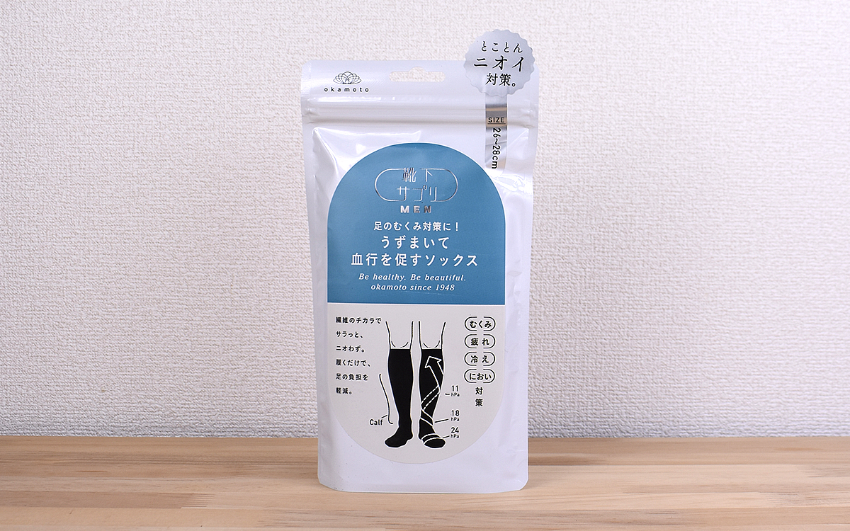 旅行や出張など、長時間外出した際に感じる足の疲れ。また汗をかきやすい時期はイヤなにおいも出てしまうため、「周りの目が気になる…」という人は多いと思います。1日中デスクワークの私もむくみやにおい対策に役立つアイテムが欲しくなり、「靴下サプリ メンズ うずまいて 血行を促すソックス」(1980円/税込)という商品を購入。いったいどのような性能を備えているのでしょうか。
