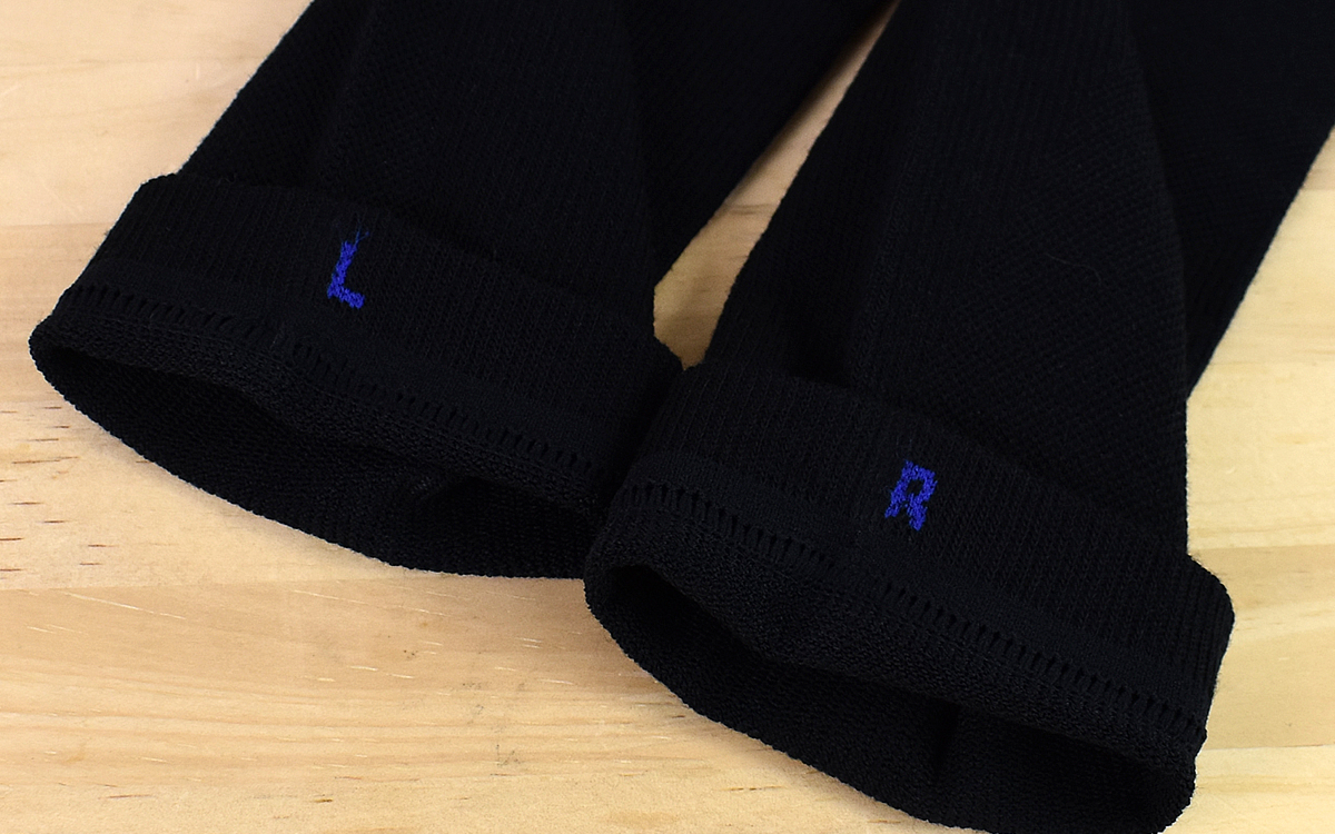 一見、普通のソックスと変わらないように思えるものの、よく見てみると足の向きに対してうずを巻いた繊維の帯が。じつは「スパイラル着圧」と呼ばれる独自設計の特許技術で、つちふまず・足首・ふくらはぎをバランスよく締めつけてくれるのが特徴です。ちなみに左右が決まっているソックスなので、裾の裏にある「L・R」マークを確認してから履くようにご注意を。