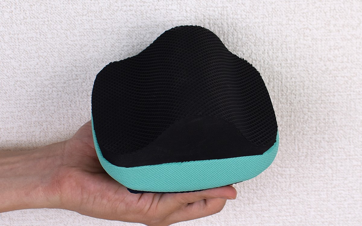 商品名のごとく“ころん”とした形状で、パっと見ただけではイマイチ使用方法がわからない同商品。生地にはポリエステルやレーヨンなどが使用されていて、一部が通気性の良いメッシュになっているのがわかります。