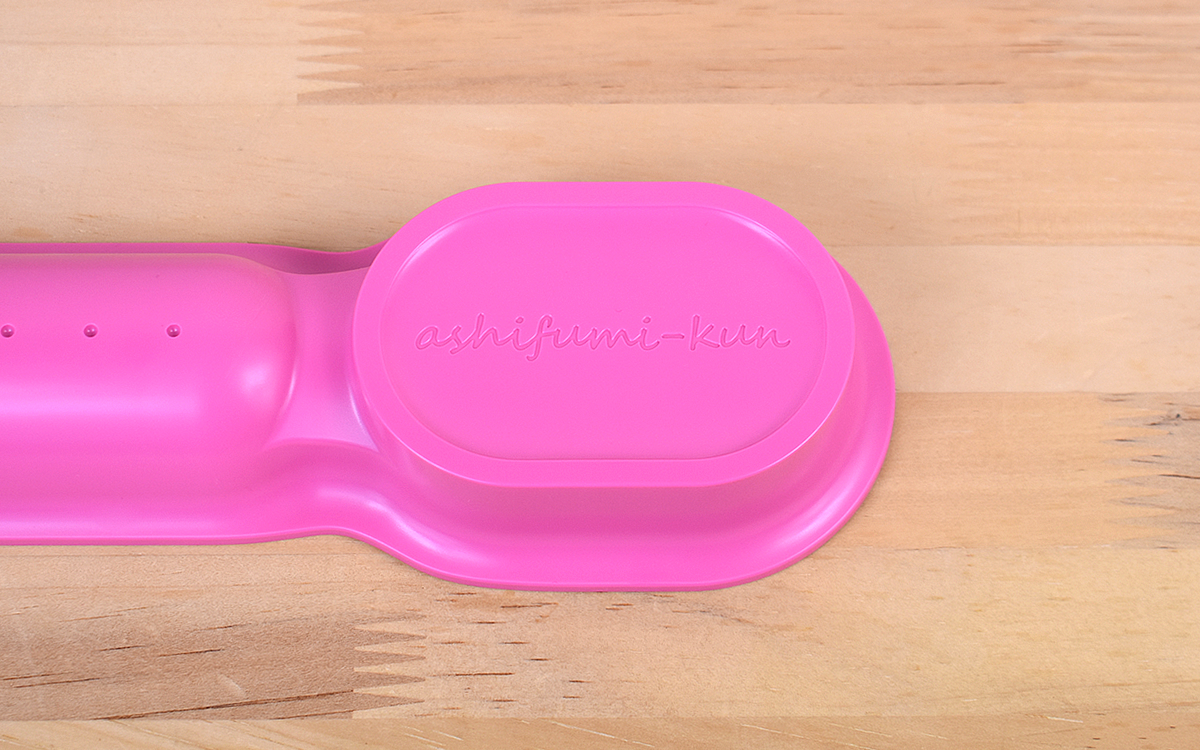 2本で1セットの同商品は、1本あたりの重さが約115g。サイズは295(幅)×80(奥行)×30mm(高さ)の細長い形状で、平坦な面にはローマ字でおしゃれに「足ふみ君」の文字が。フラット部分を除いたデザインは、アーチを描いたかたちになっています。ちなみに同商品の考案には、竹でできた“青竹ふみ”からヒントを得ているそう。