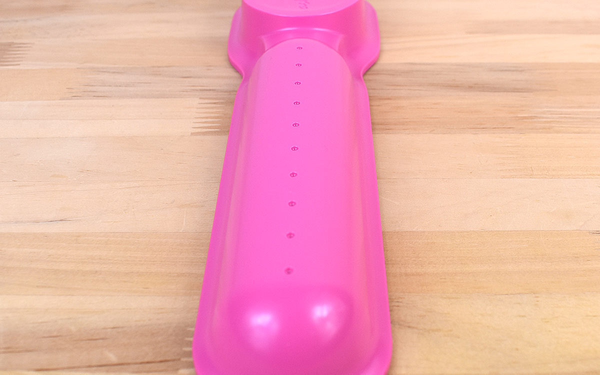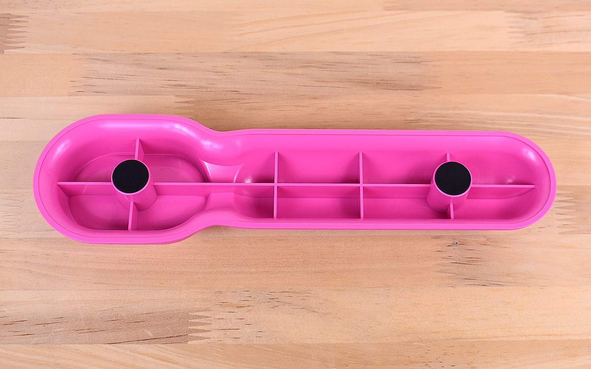 あまり見慣れないデザインではあるものの、付属パーツが一切ない「足ふみ君」の構造はとてもシンプル。ひっくり返した内側は空洞ですが、2か所にすべり止めを備えているので安心して体重をかけることができます。