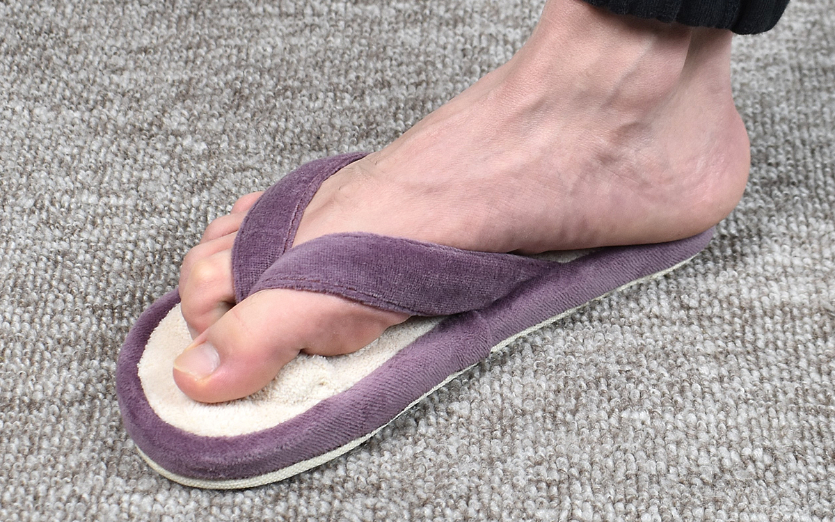 実際にスリッパを履いてみたところ、段差を足指全体で包みこむ状態に。下の画像を見れば、足指が段差をしっかり掴んでいるのがよくわかるのではないでしょうか。実は同商品、足指のトレーニングに良いとされているタオルつかみ運動を履くだけでできるのが特徴。確かに段差があるだけで足指に力を入れることになり、足指の先端が浮くことで指の開閉を繰り返す“グーパー運動”もスムーズにおこなうことができました。