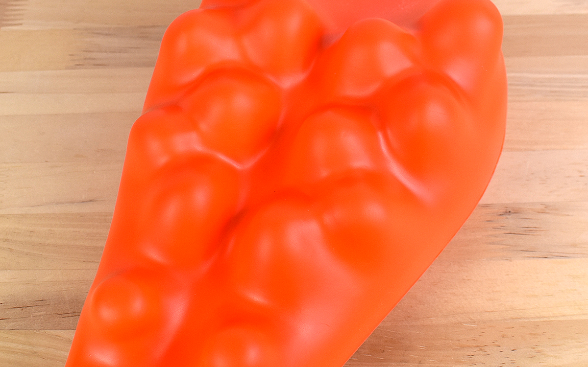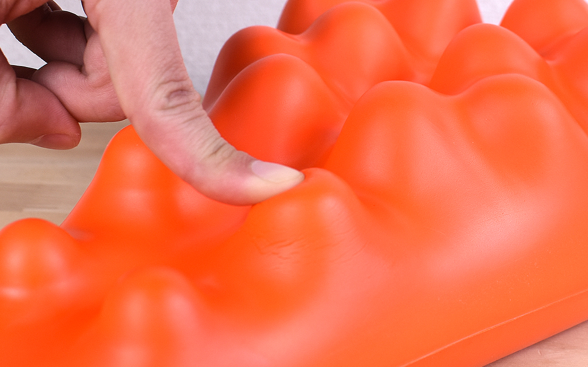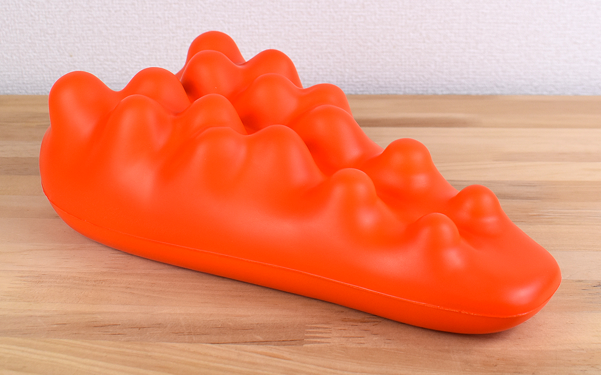同商品のサイズは330(幅)×175(奥行)×95mm(高さ)で、素材はポリウレタンのみ。突起を指で押してみると適度な弾力と硬さを併せ持ち、大きさはそれぞれ異なっていても規則正しく対称に並んでいることがわかります。