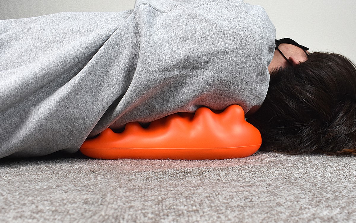 それではバックストレッチャーを使ってみましょう。といっても平らですべりにくい床面に設置したら、あとは肩甲骨周辺に本体上部の突起が当たる位置で仰向けになるだけ。もちろん気持ちよさを感じる場所にずらしながら使用してもOKです。実際に寝転がってみたところ、背中にゴリっと強い刺激を受けることに。対称に並んだ突起のおかげで、バランスよく背中の筋肉全体を広げてくれるような感覚がありました。