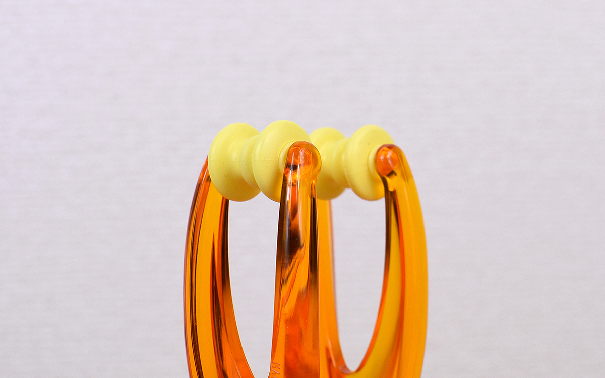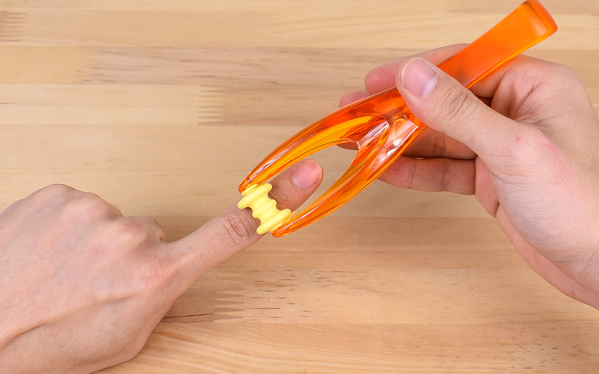 透明感あるオレンジ色のボディに、ゲルマニウム配合のローラーが2つついた同商品。TPE樹脂製のローラーはわずかに弾力があり、指を挟んでも痛くありません。またトングの要領で指を掴めるため、力加減を自分好みに調整可能。程よい力のマッサージを堪能できます。