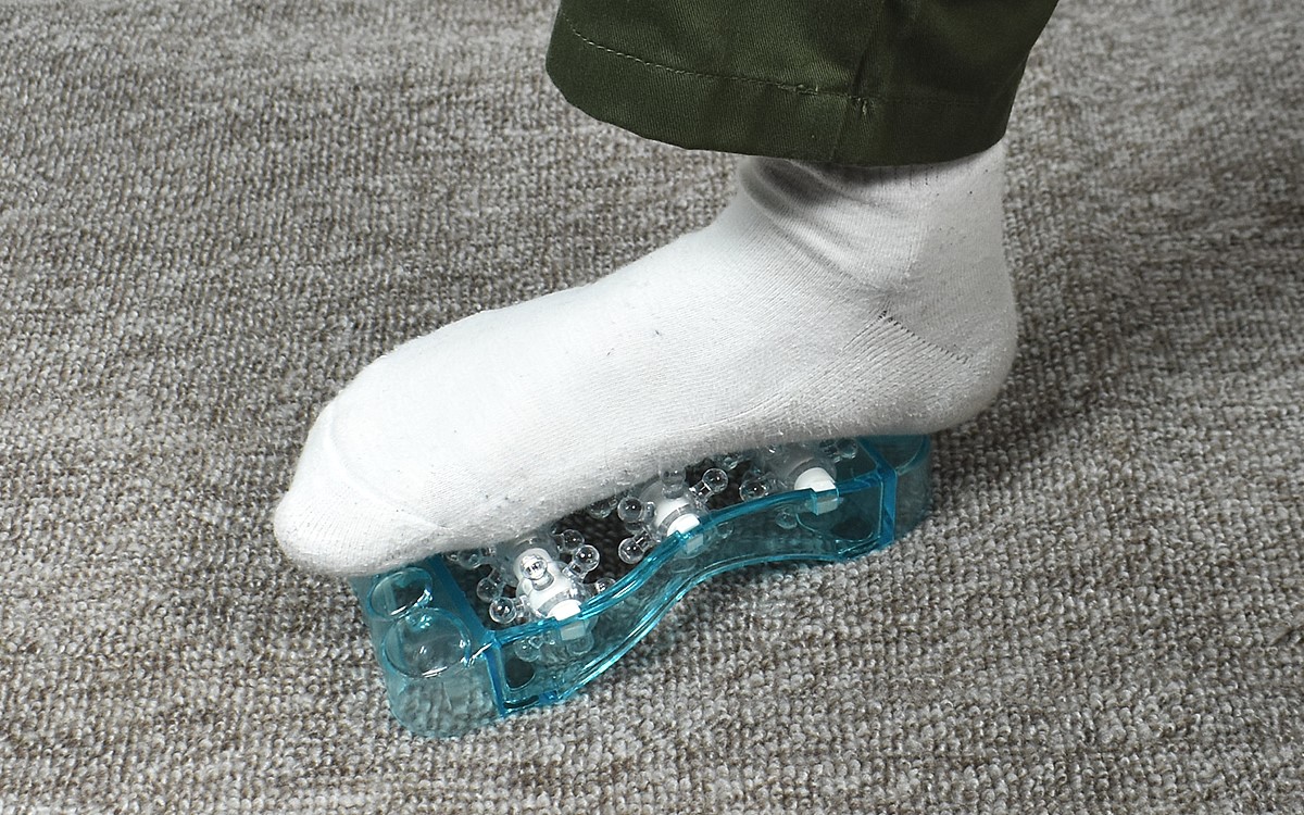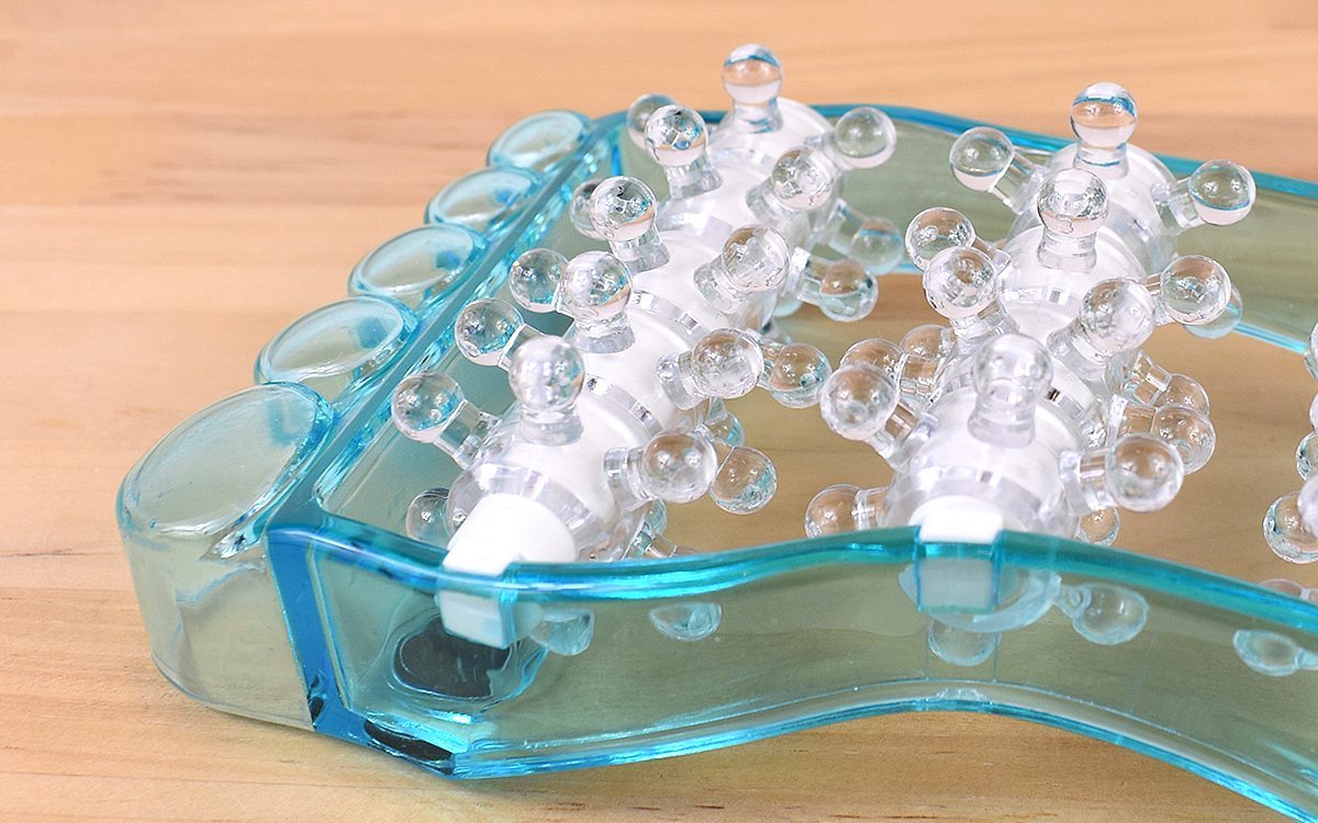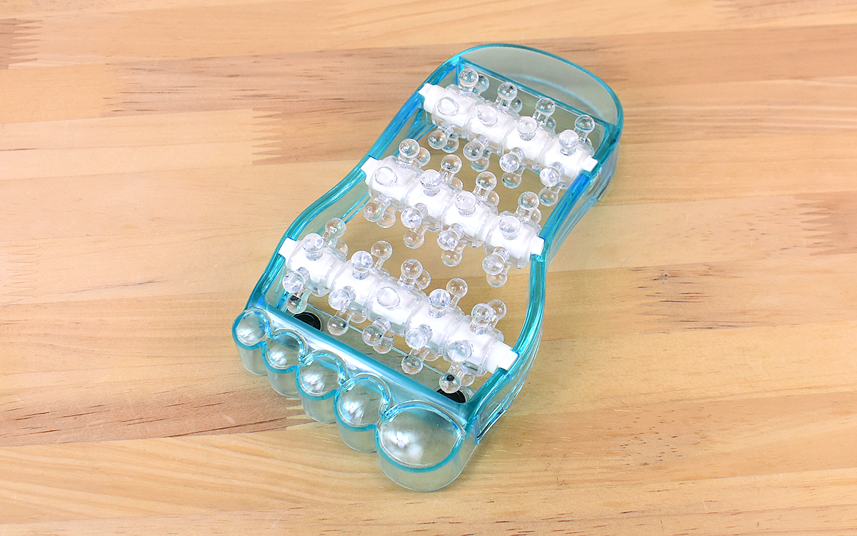 足のかたちを模したデザインが印象的な同商品。サイズは約10.5(幅)×5(奥行)×19.7cm(高さ)と極端に大きいわけではなく、大人の片足を乗せるのにちょうどいいサイズ感です。その一方で圧倒的なインパクトを放っているのは、本体に組み込まれた3列のローラー。無数の突起が並び、丸く膨らんだ先端部分を見るだけでその威力がイメージできるのでは?