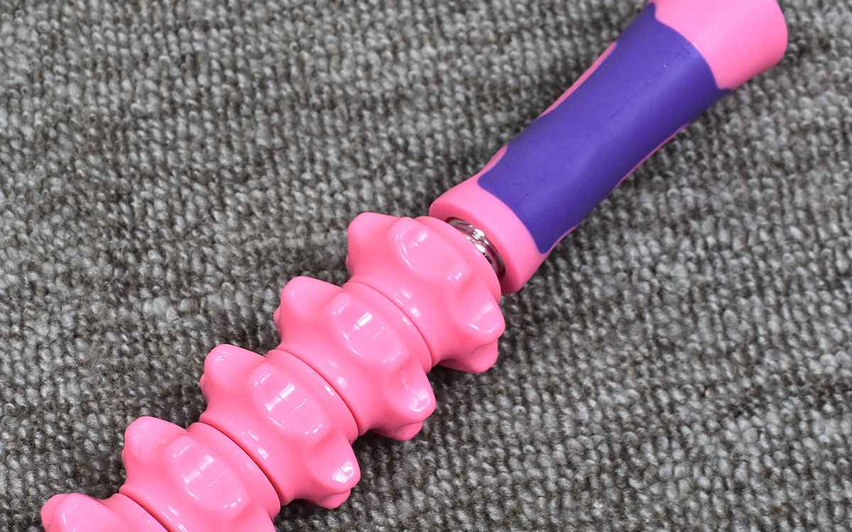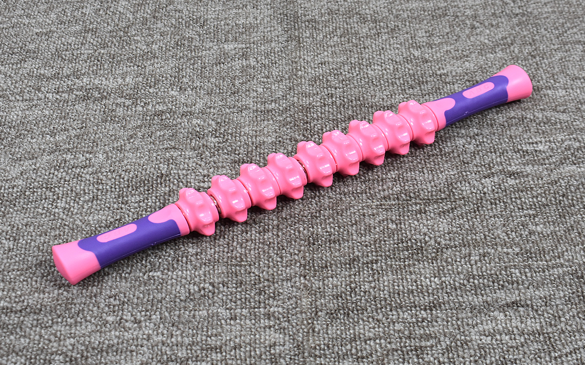 芯棒に複数ついたギアはギザギザと歯車風の形。突起が深く、より体の奥の方まで沈み込んでいきます。ギアは回転するので、ただ押しつけるだけでなくローラーマッサージも可能。血行促進にも役立つのは助かりますね。
