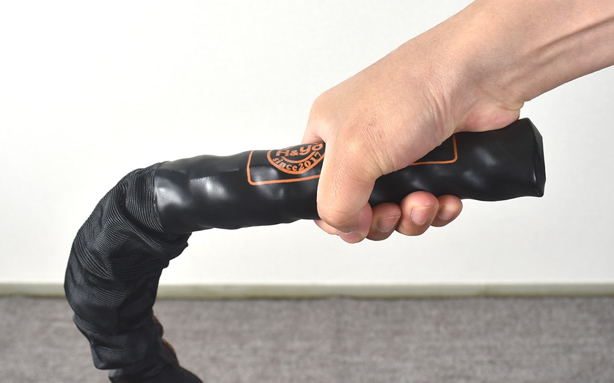 「ジムロープなわとび」は直径38mm&全長3mとかなり大きめな作り。重さは一般的ななわとびが200gほどなのに対して同商品は2.3kgもあり、回すだけで体に高負荷をかけられます。重みのあるロープだと回す時に手が擦れないか心配になりますが、持ち手部分はラバーで補強されているため安心してください。