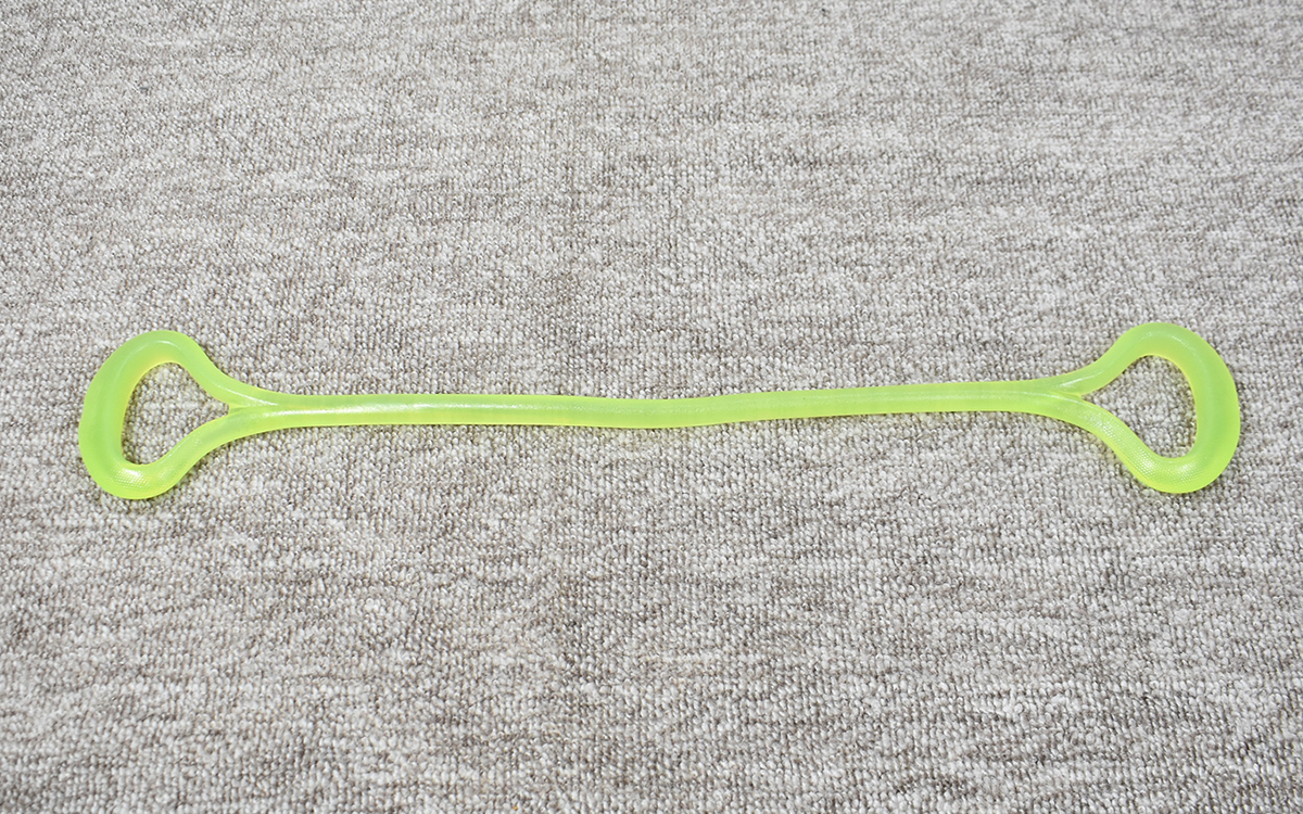 同商品の色合いは“緑”というよりも“黄緑”に近い印象。グリップ部分は手に馴染みやすい形状で握りやすく、持ち手も“ゴム製”なので「引っ張った時に手が痛くなる」といった心配もありません。全長は約61cmで、短すぎず長すぎずちょうどいい長さ。試しに引っ張ってみると、程よい力加減でエキスパンダーを伸ばすことができました。