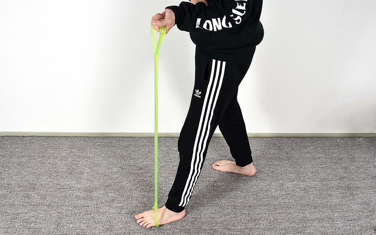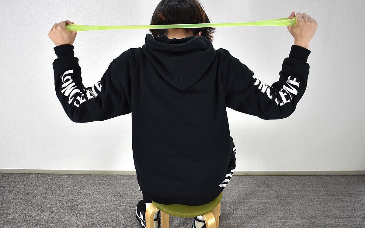 使い心地を確認したところで、今度は広背筋(背中)を使うエクササイズ「ローイング」に挑戦。イスに座った状態で両足にかけたら、前傾姿勢のままヒジを後ろに引いていきます。動作自体は非常にシンプルですが、思っていたよりも広背筋に負荷がかかっていることを実感。毎日続ければ、背中についた“ぜい肉”を落とすことができるのではないでしょうか。