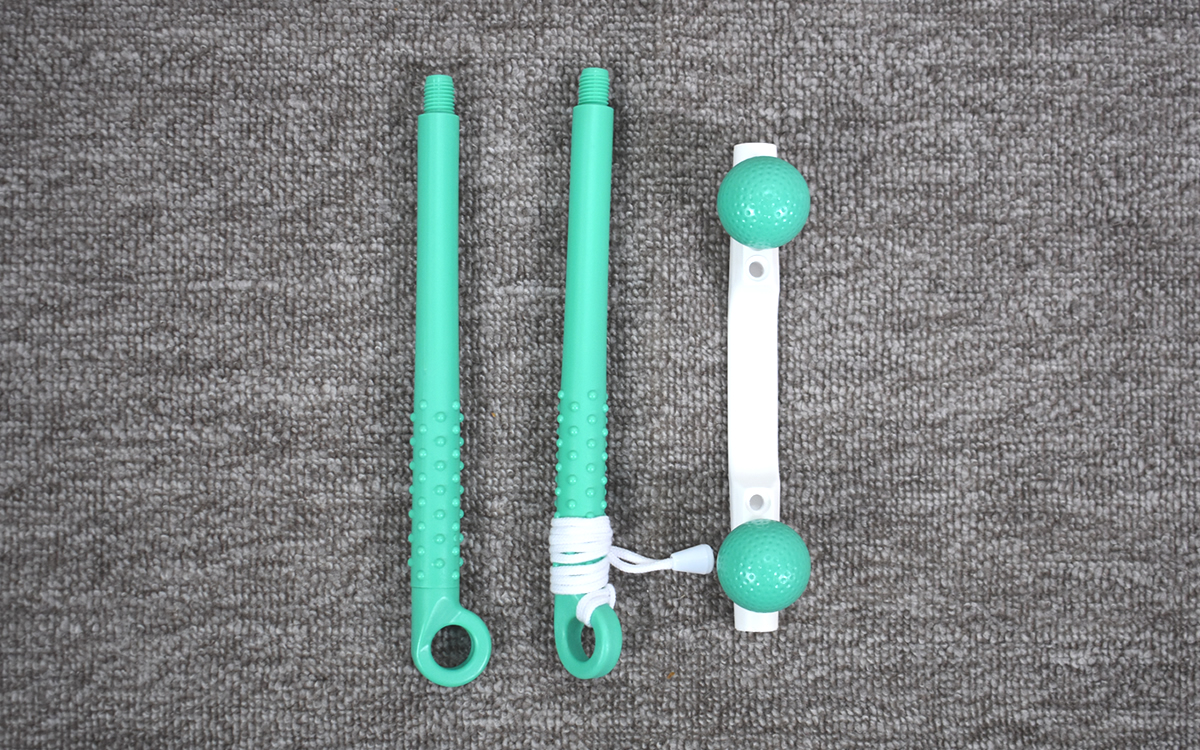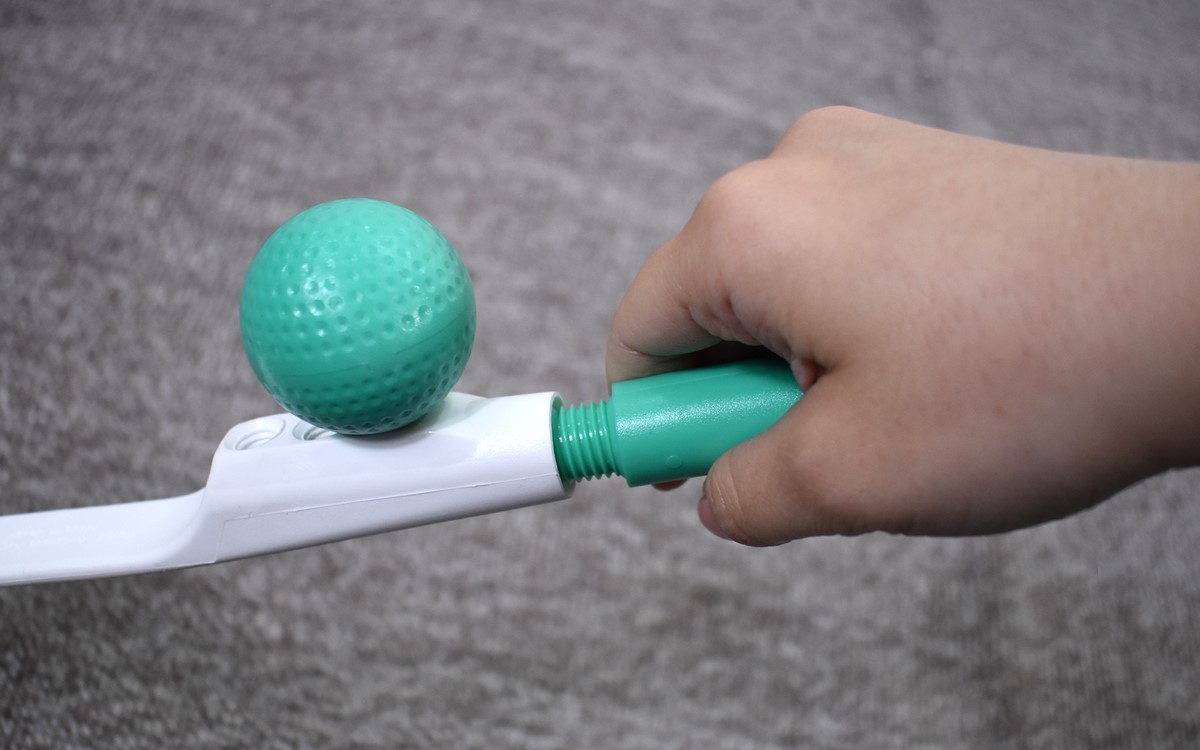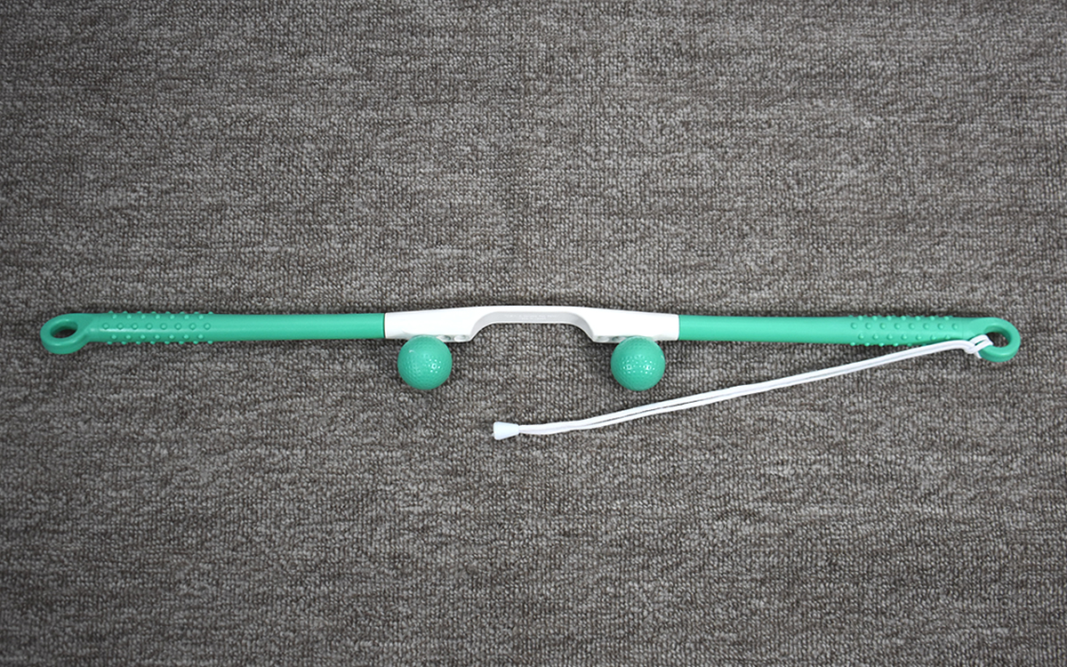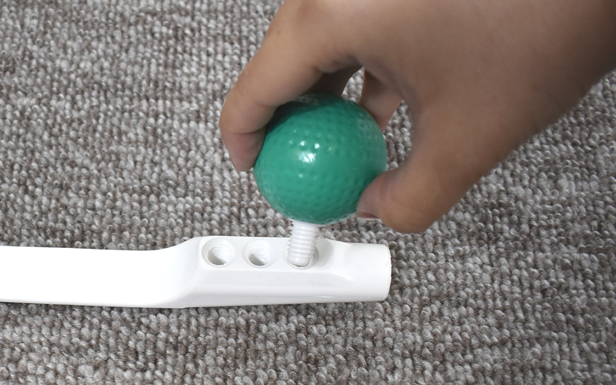 「テコの原理」を利用して、力をかけずにこり固まった首や肩の筋肉をほぐせる同商品。まずは、穴の空いている部分にゴルフボール型のゴムボールを2つ装着していきます。ボールは回してねじ込んでいけば簡単に取りつけられるため、あっという間にセッティングは完了。ボールの幅を調節できるように、穴がそれぞれ3か所ずつ用意されているのもうれしいポイントです。