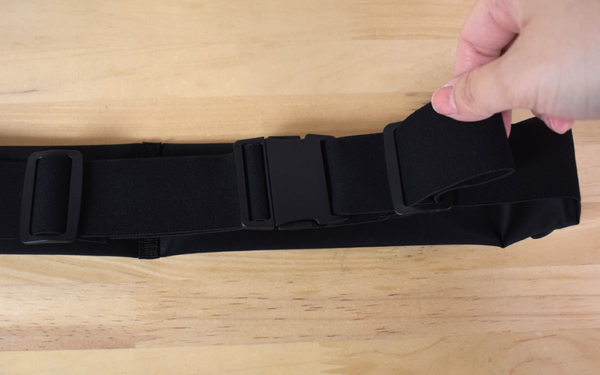 実際に腰に装着してみたところ、アジャスターとゴムのおかげでしっかりとウエストにフィット。体を動かしてもポーチがユサユサと揺れたりすることはなく、動きに制限がかかりません。軽くてコンパクトな本体は、ポーチをつけている違和感を最小限にとどめてくれました。