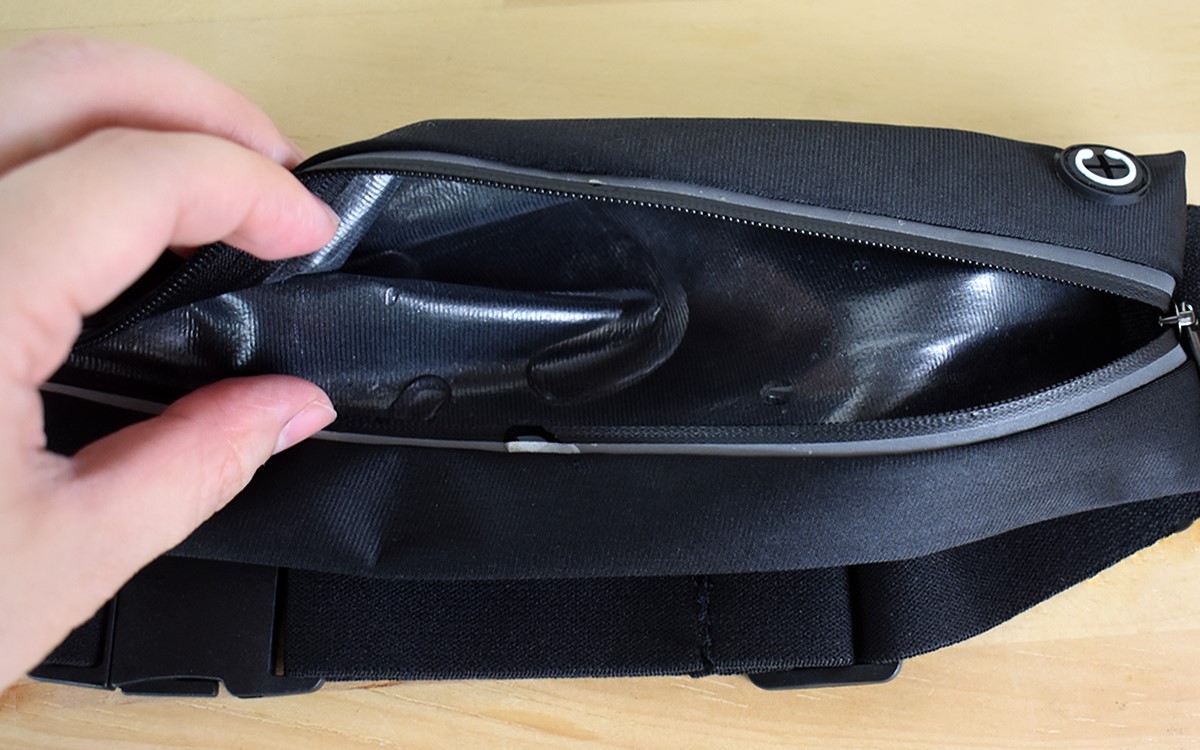 雨や汗に強い防水性も、ランニング用ポーチにおける重要なポイントでしょう。同商品はウェットスーツにも使われている素材が使用されており、本体はツルツルとした手触り。外側が濡れても荷物に染みこんだり、内側で水がこぼれても外に染み出してきたりする心配はなさそうです。