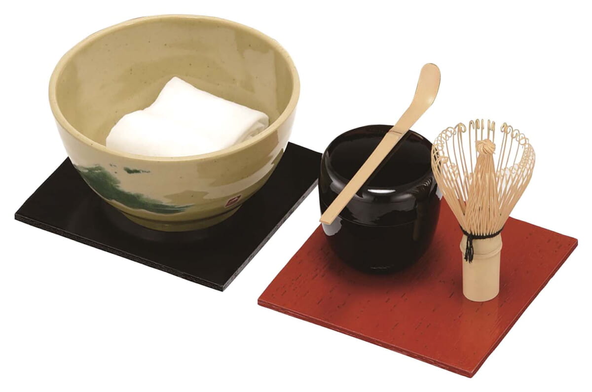 割れにくいメラミン製の茶碗やコンパクトな茶せん&茶杓など、アウトドア仕様の携帯用野点セット。山やキャンプ場で過ごすリラックスタイムに、友人や家族と優雅に野点を楽しめる。