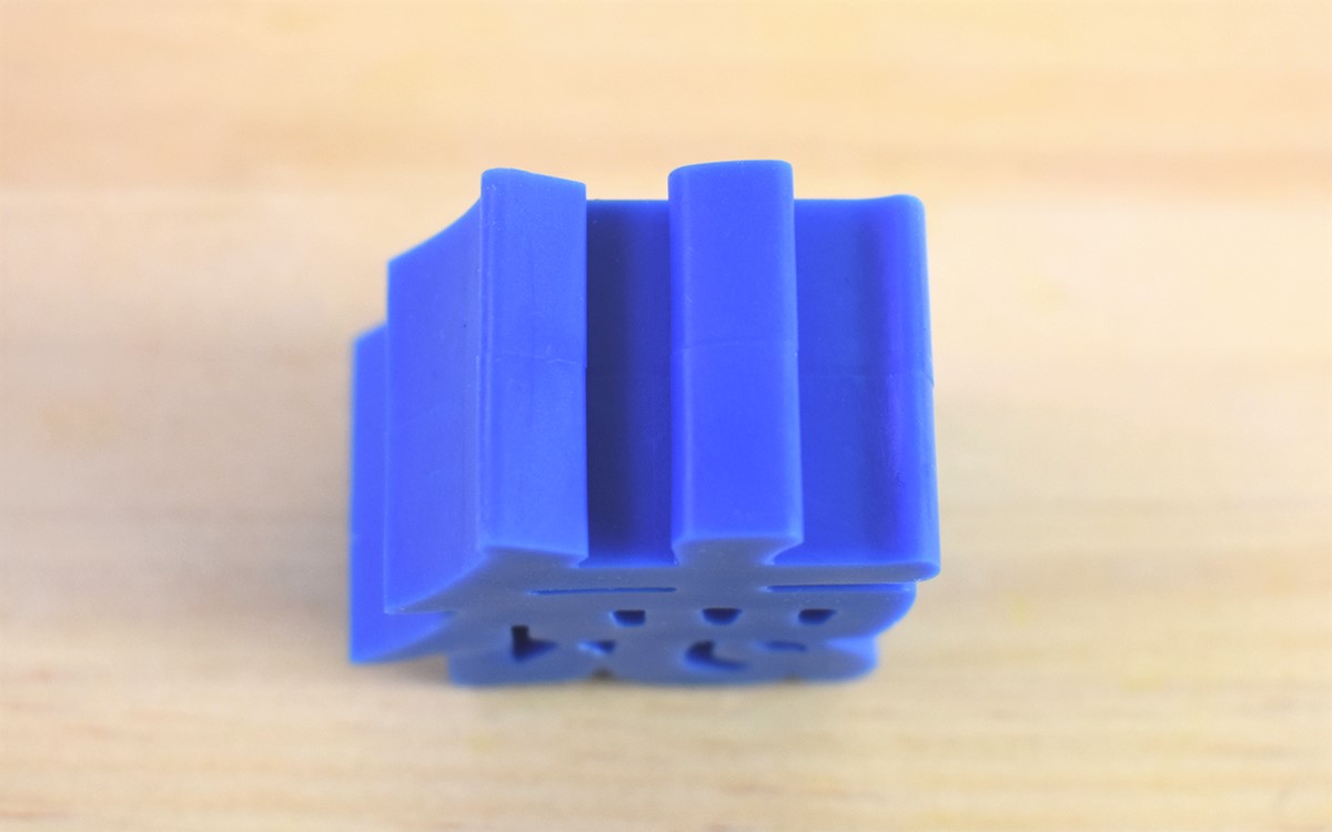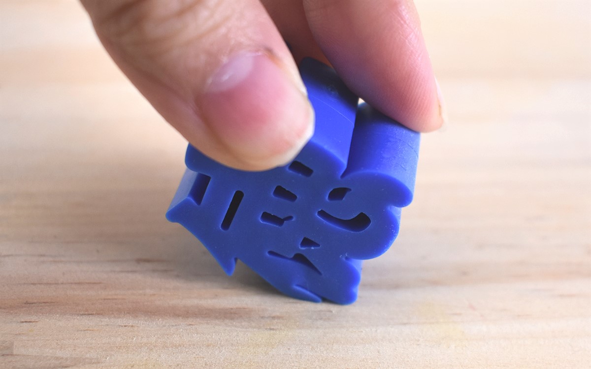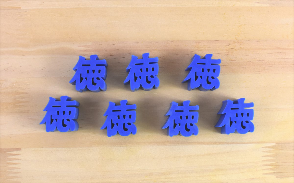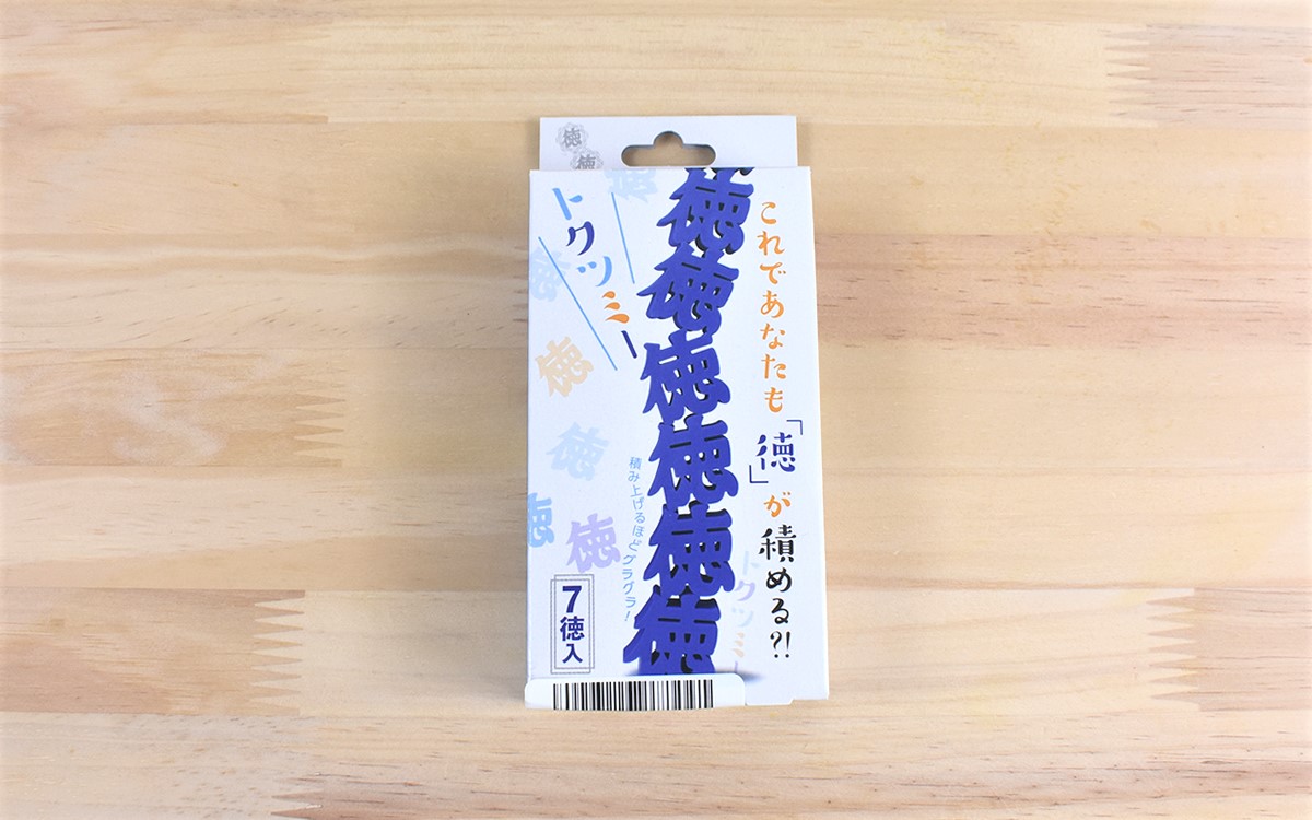 パッケージを開けると、出てきたのは7つの「徳」ブロック。綺麗な青色は、パッケージによると「集中力を高める青色」だそうです。縦横が約3cm、厚みが約2cmとほどよい大きさなので、指先で扱うにはピッタリのサイズ感。大人も子どもも問題なく楽しめそうですね。ブロックといっても、素材はエラストマー製で消しゴムのような触り心地。強く握ると、心地よい弾力とともに少しだけ沈み込む感じがクセになります。積み上げたブロックが崩れた時も家具などを傷つけず、手足に当たっても痛くないのがうれしいポイント。