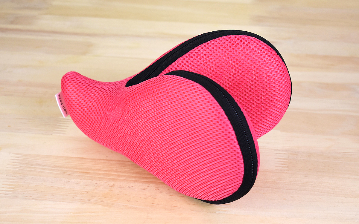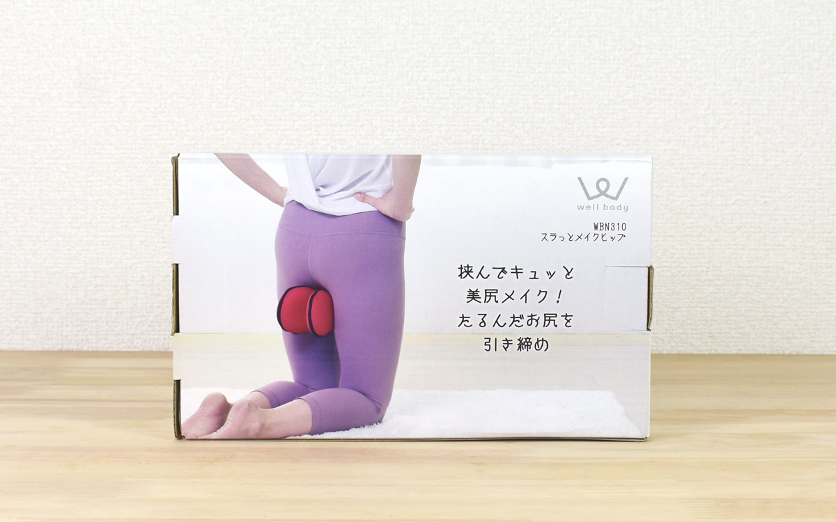 公式サイトによれば、サイズは220(幅)×130(奥行)×115mm(高さ)。重さはおよそ280gで、エクササイズグッズとしてはコンパクトな印象です。これ1つでヒップアップ、バストアップ、太ももの引き締め運動などができるのですが、まずはヒップアップからおこなっていきましょう。