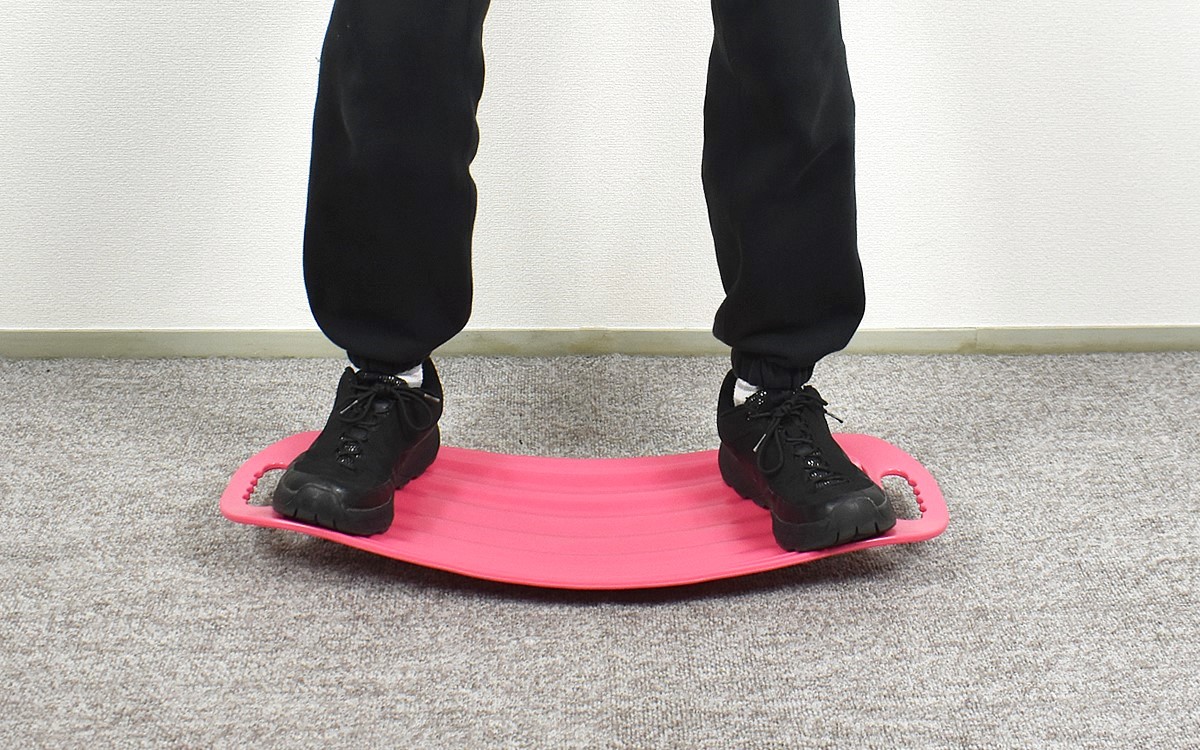 グラグラしないか心配しつつボードに乗ってみたところ、ボードが広いためか自分で安定するポジションを探しやすく、上手くバランスをとることができました。ボードに立つのは簡単ですが、落ちないようにバランスを保っているとしっかり筋肉に負荷が。辛い動きでなくてもたっぷり運動している感覚を味わえます。