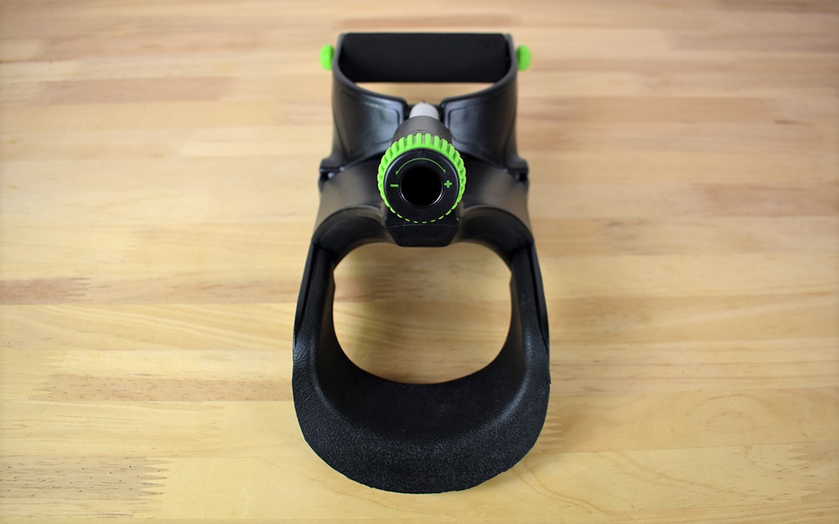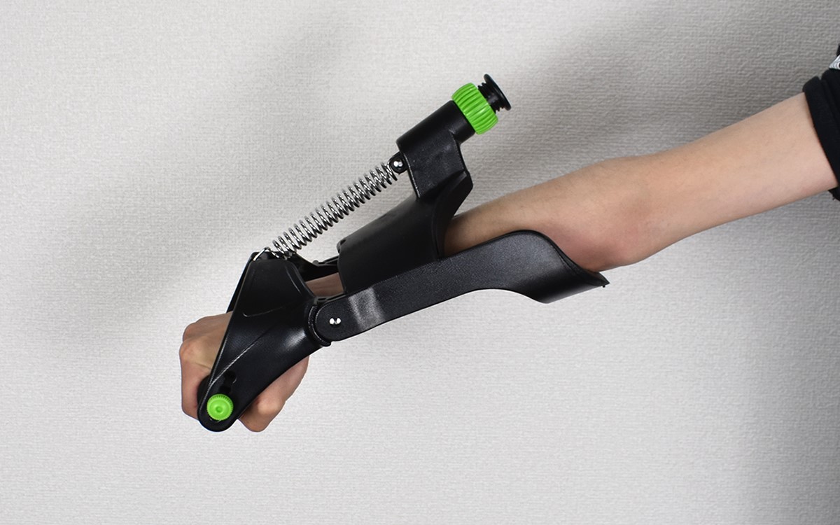 試しに装着してみたところ、“肌の接地部分”にクッションがあるおかげで着け心地は快適。自分の手の大きさに合わせて“グリップの位置調整”もおこなえるため、ちょうどいいポジションでグリップを握ることができます。