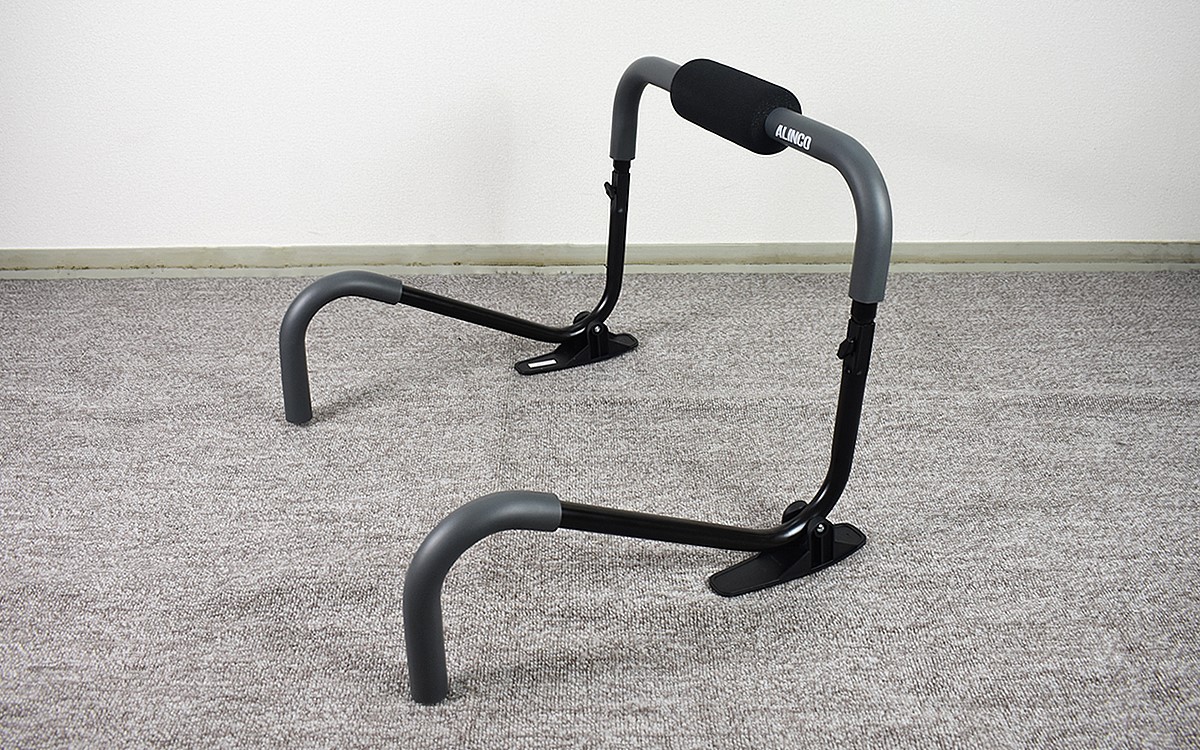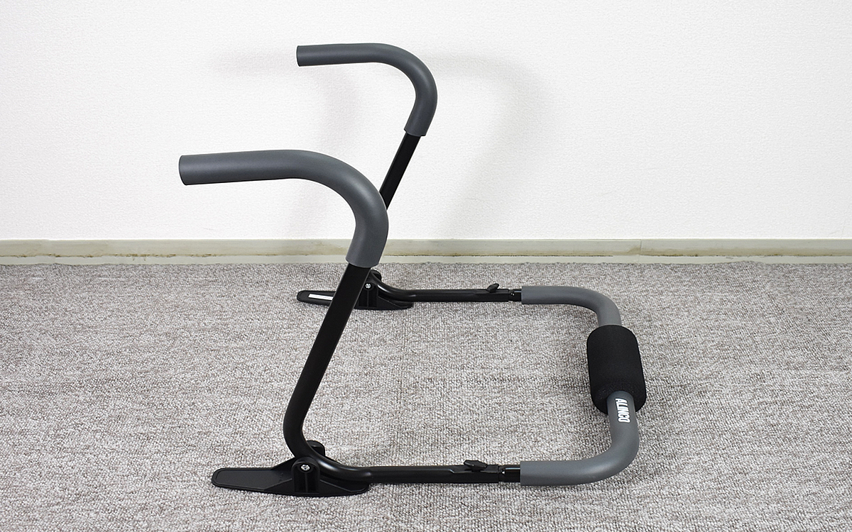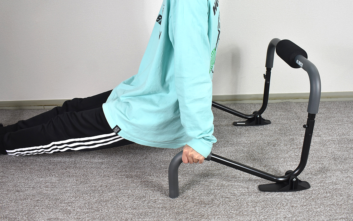 続いて器具の置き方を変え、広背筋&上腕三頭筋のトレーニング。特に器具を組み立て直す必要がなく、すぐ別の運動に使えるのは助かりますね。バーを持ってお尻を浮かせるのは少々辛い姿勢ではあるものの、個人的に腕立てよりは簡単で続けやすい印象です。